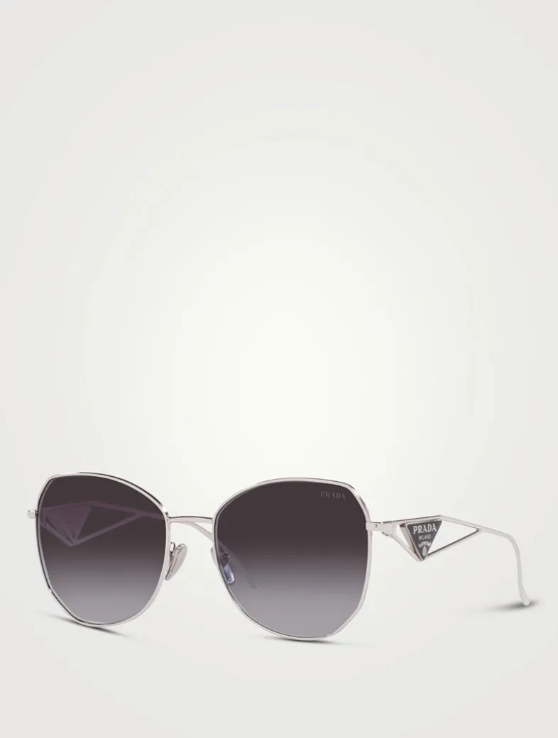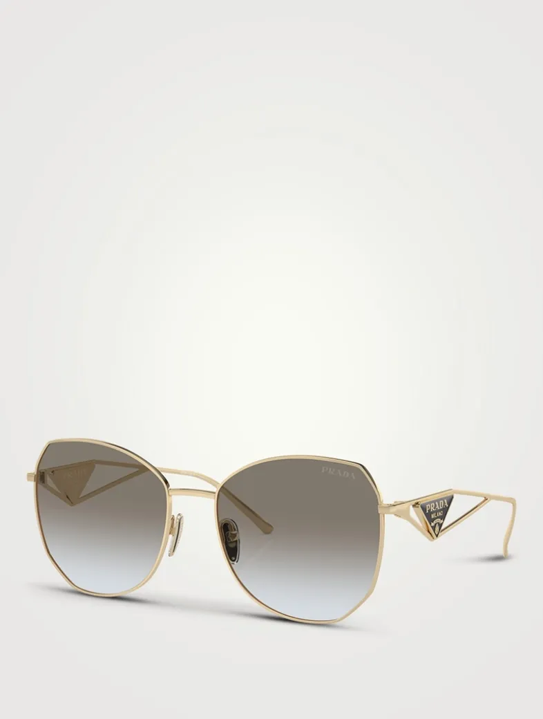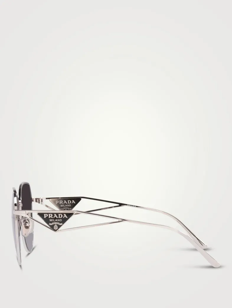Crafted with a polished metal frame, these rounded sunglasses are accented with classic PRADA triangle logos at the temples. This style is RX-able.