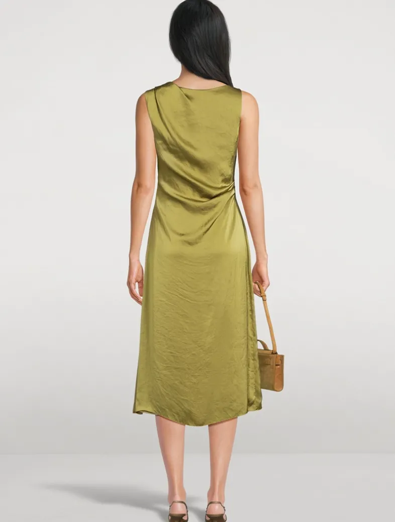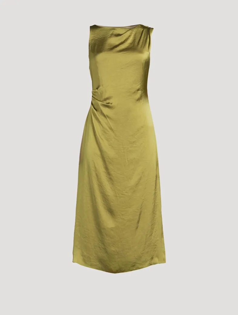 Cut along a boat neckline, this sleeveless dress is tailored for a curve-hugging sheath silhouette. It’s crafted with a crinkled satin with an elegant drape.