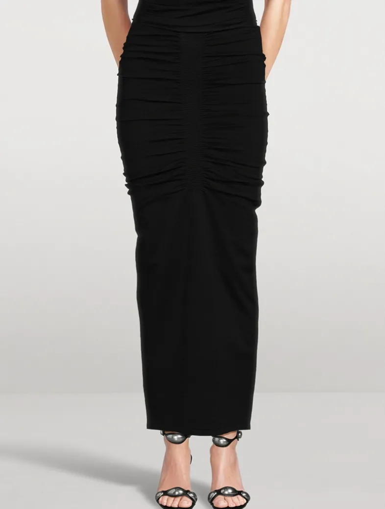 A hyper-extended ruched waistband defines this pull-on jersey skirt. It has a curve-hugging fit and an ankle-length hem.