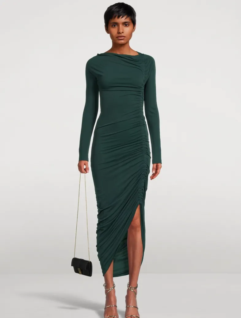 A clean-cut silhouette with gathered details that follow and flatter the form. Stretch jersey brings to life this mid-length dress with ruched folds that run the entire length of the left side. The asymmetrical hem is complemented by a high slit and concealed zip on the right shoulder.