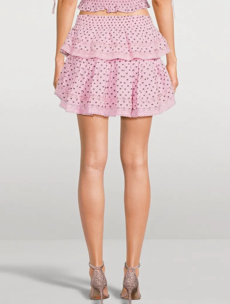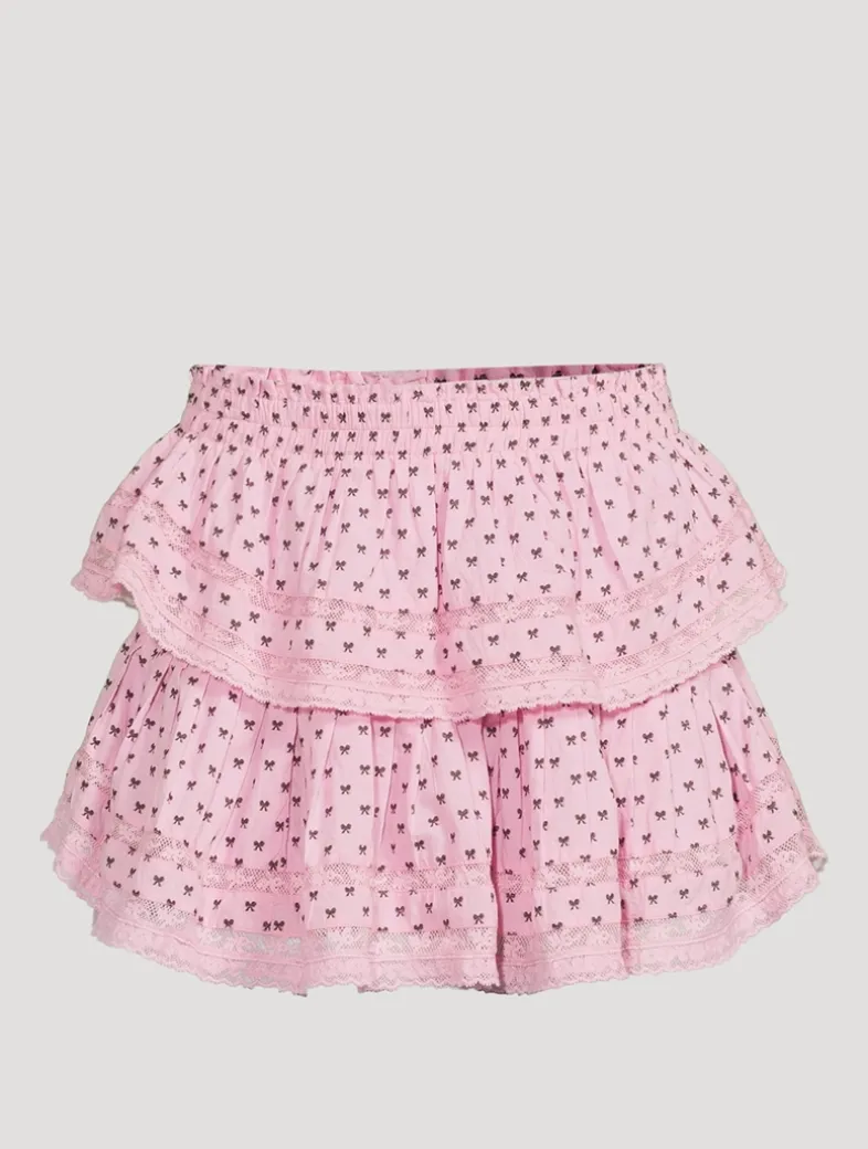This ruffled mini skirt is made in a textured, cotton fabric featuring a clip bow and bow dot woven throughout. It features intricate inset lace trims and allover pintuck details. The elasticated waistband offers flexibility in comfort and styling. Tiered ruffles exude effortless femininity. The mini is finished with a frayed, raw hem for added playfulness.