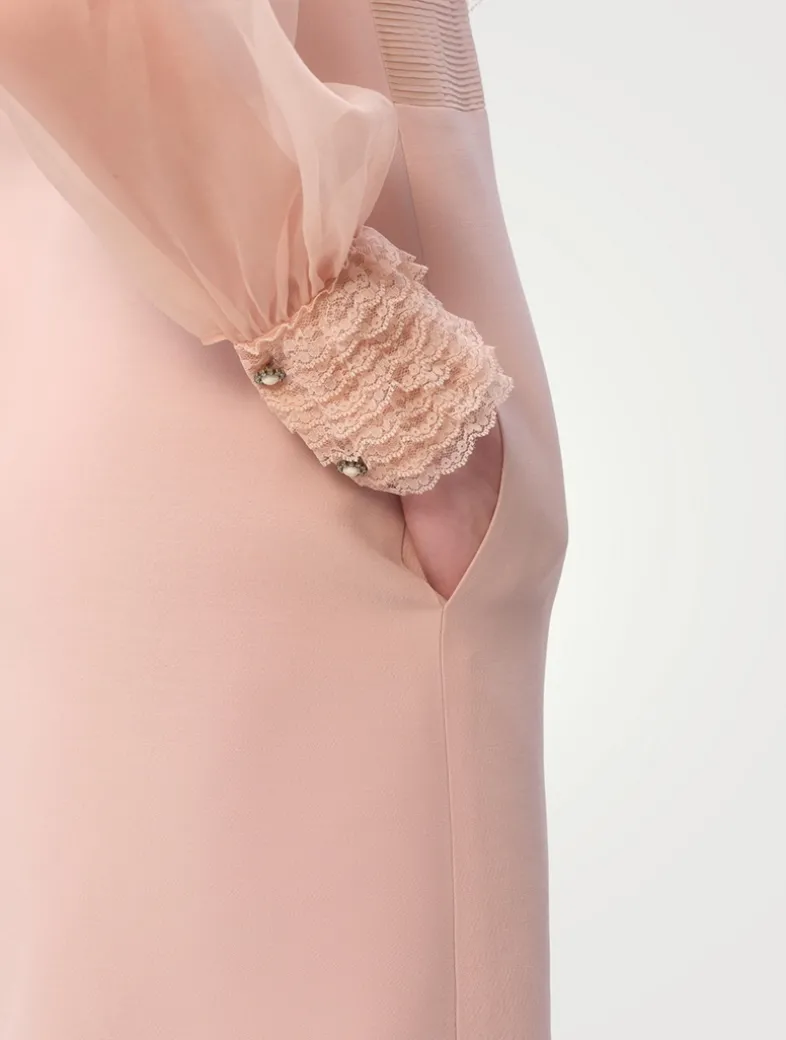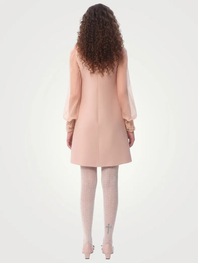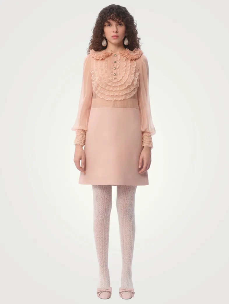 This silk dress is crafted in Valentino’s signature crêpe couture fabric with partial lace and organza embroidery. The semi-sheer bodice is framed by a ruffled Peter Pan collar and features jewelled buttons at the front and cuffs. A silk Habotai lining completes the look.