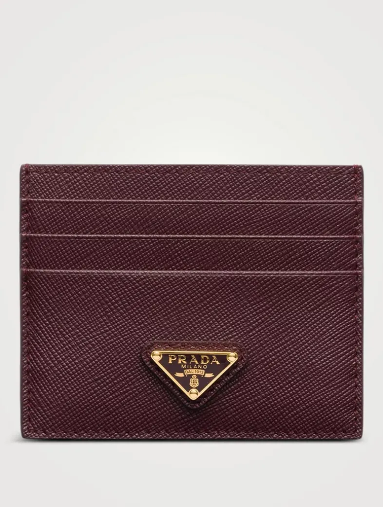 Enameled metal triangle logo Six card slots One inside pocket Moire and Saffiano leather lining