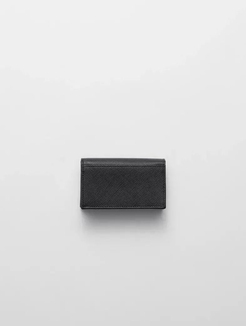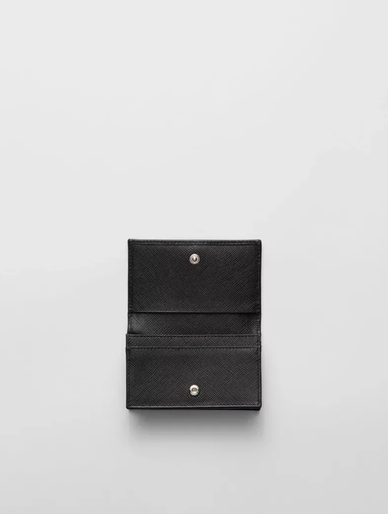 Saffiano leather Steel-finish metal hardware Enameled triangle logo Snap closure Four card slots inside
