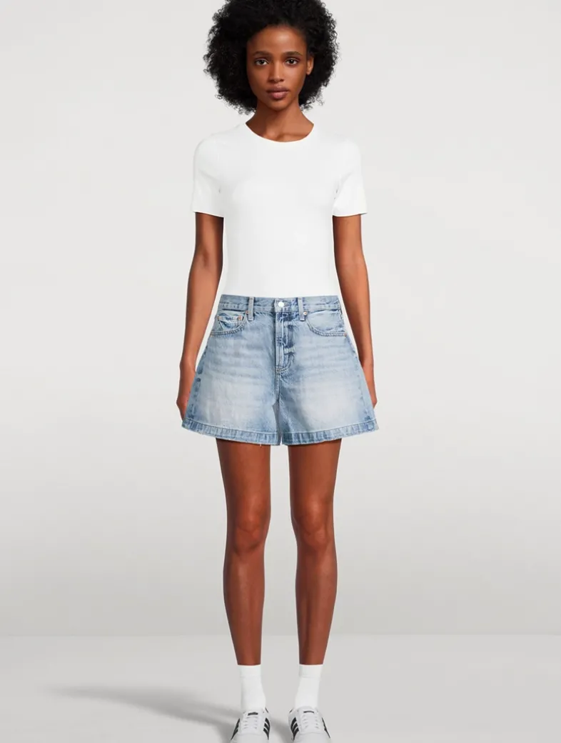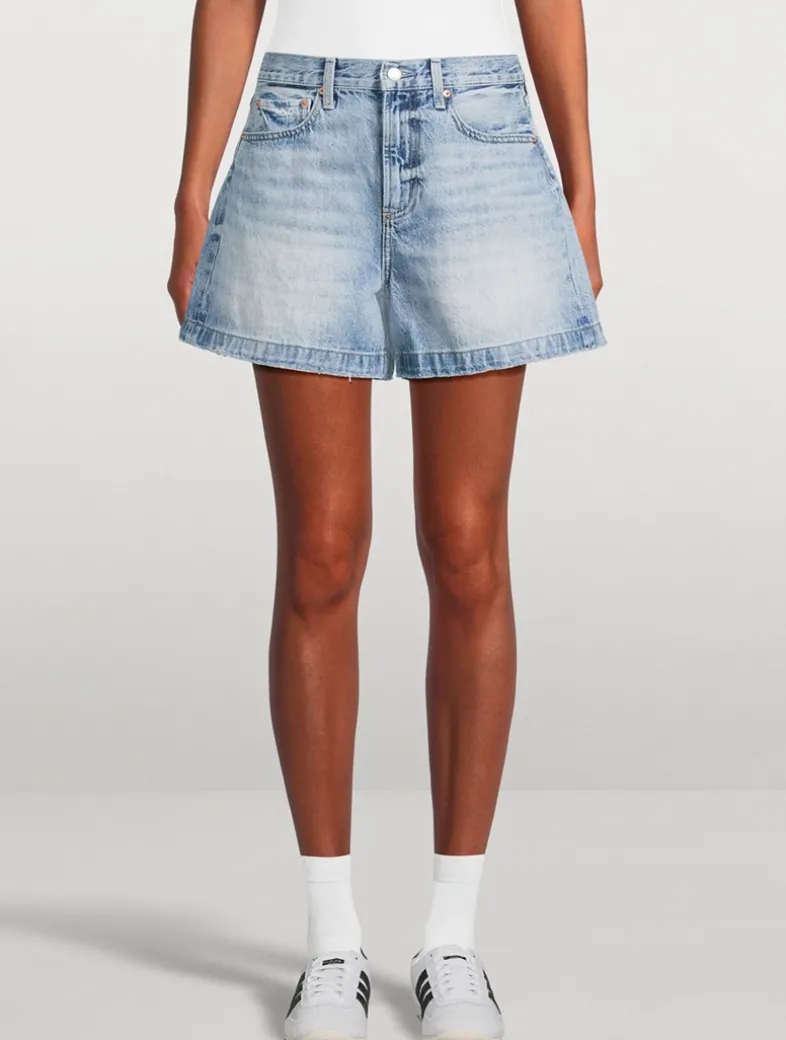 Featuring an ultra flattering high-rise waist, a relaxed A-line fit, and medium length, these shorts are crafted from rigid non-stretch denim designed to hold its silhouette.