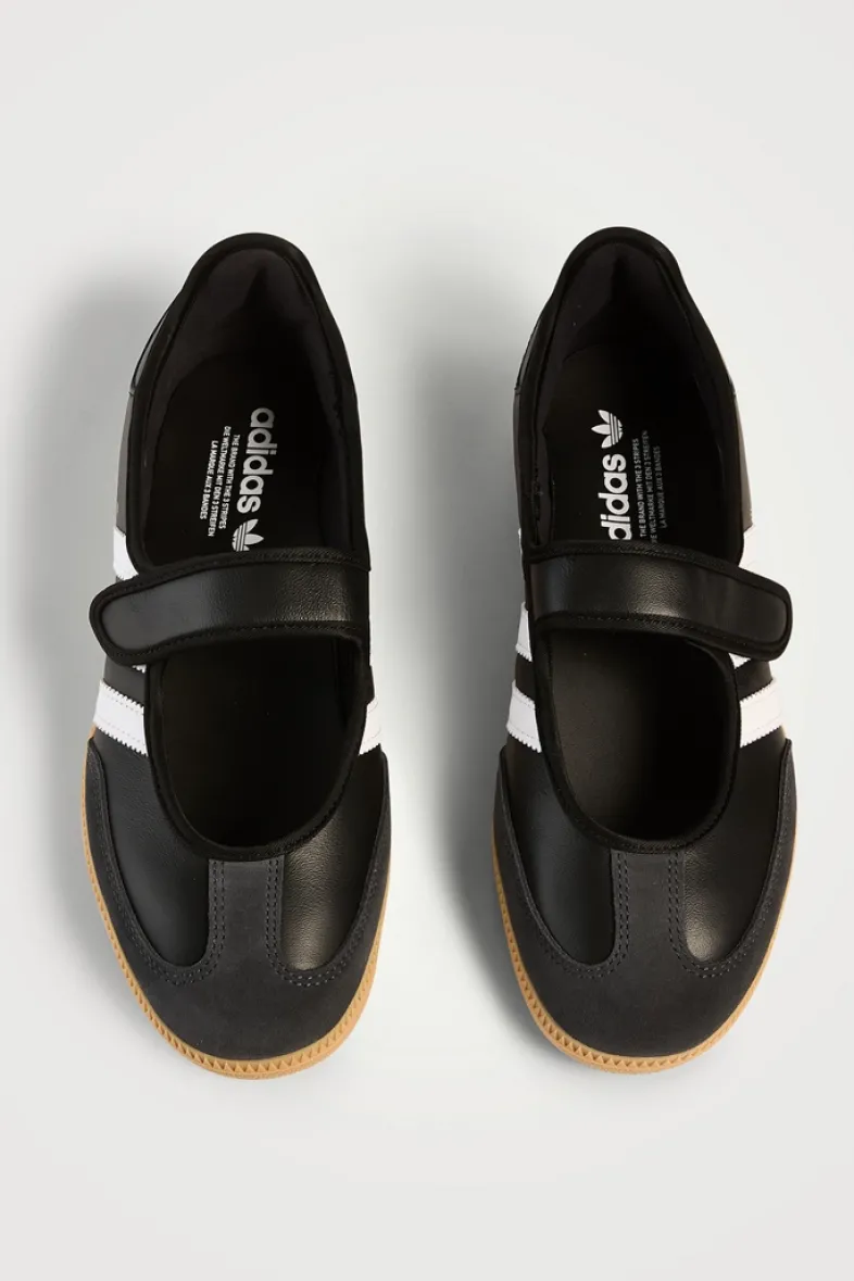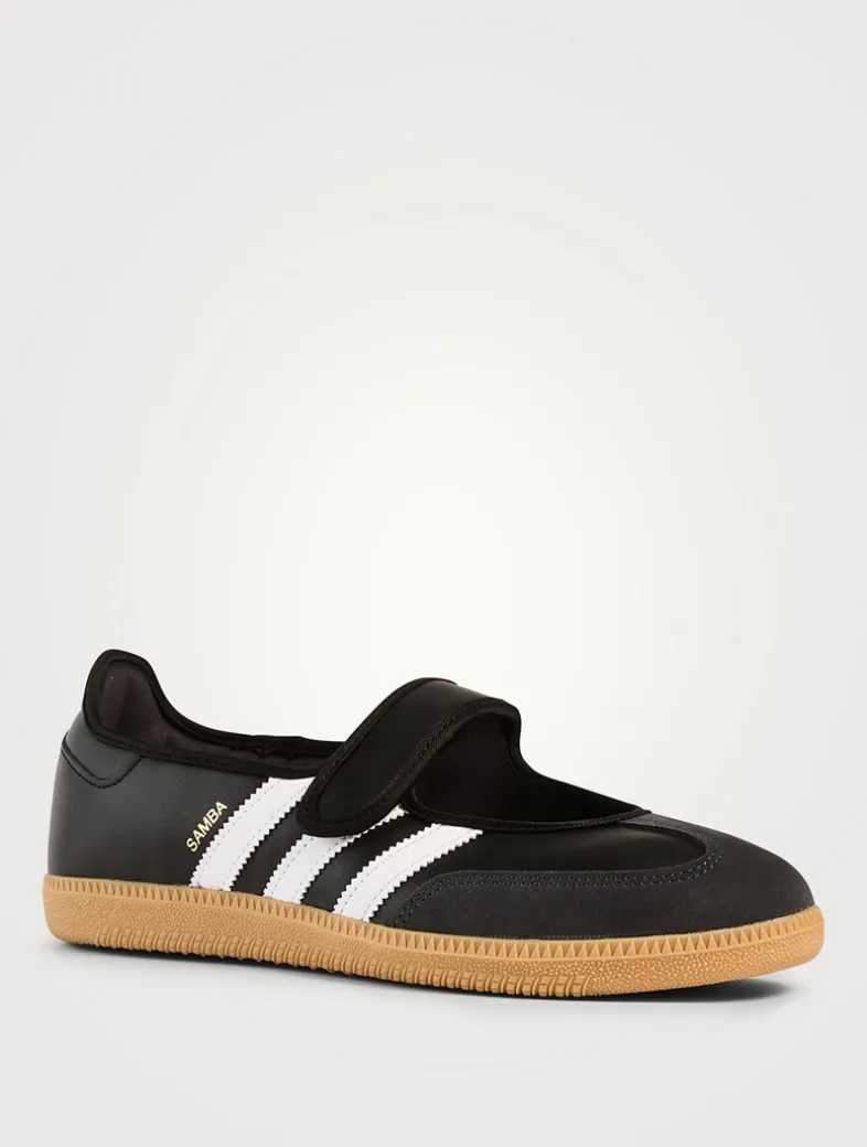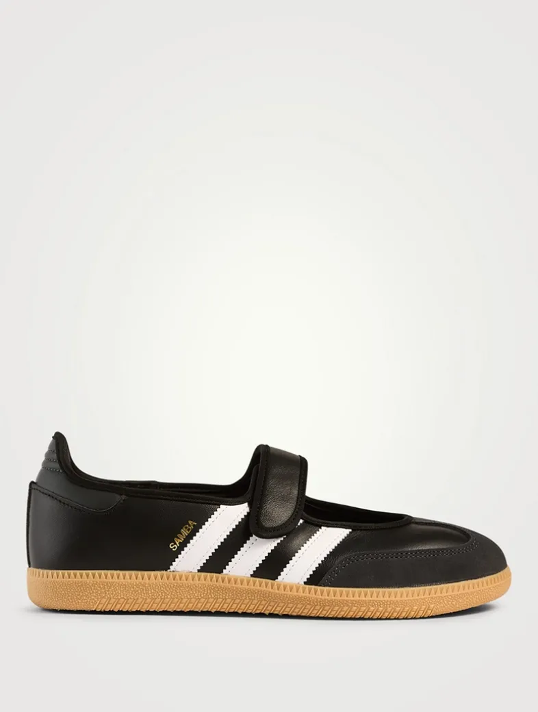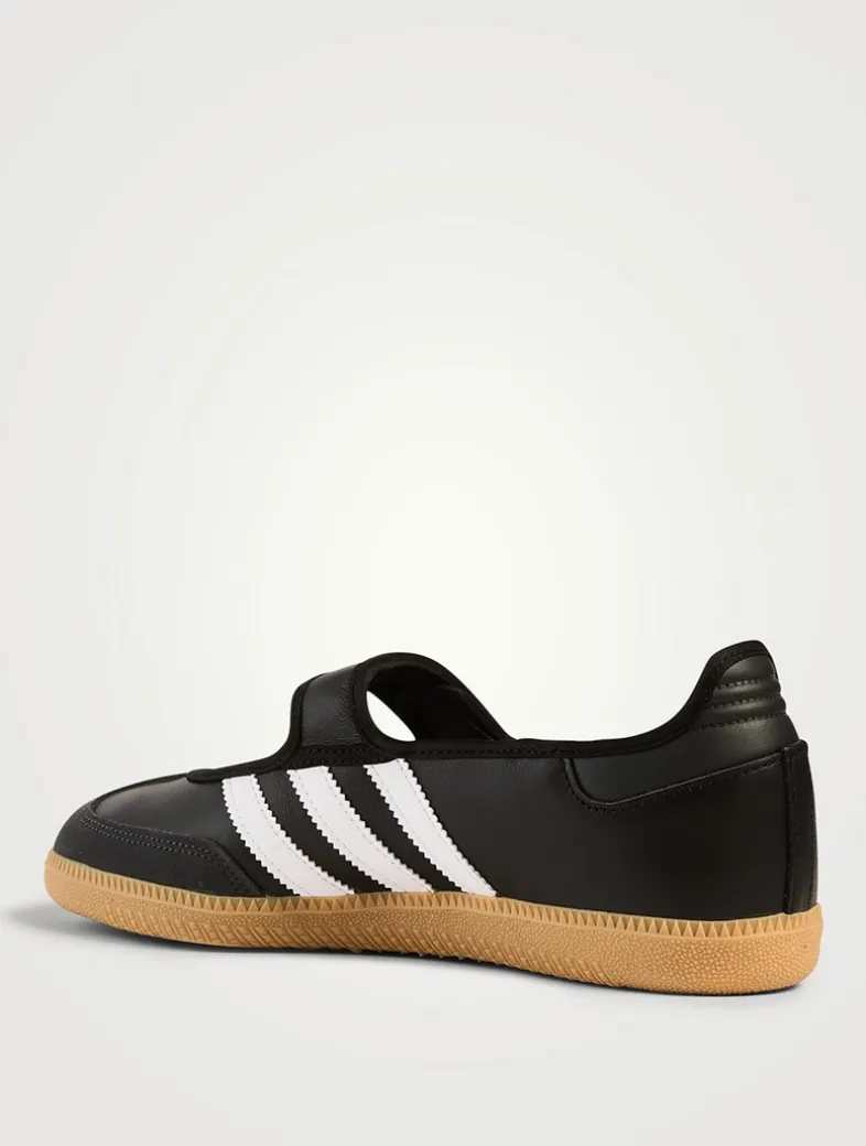 The adidas Samba shoes get a modern makeover, blending into a trendy Mary Jane aesthetic. With a smooth leather upper and signature serrated 3-Stripes, these low-profile shoes offer a fresh take on a heritage style. The smooth satin lining gives the shoes a luxe feel, and a grippy gum rubber outsole keeps the look classic.