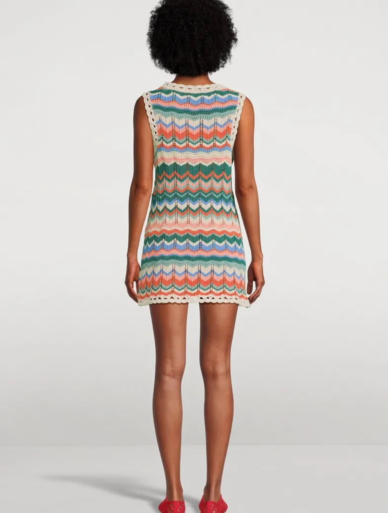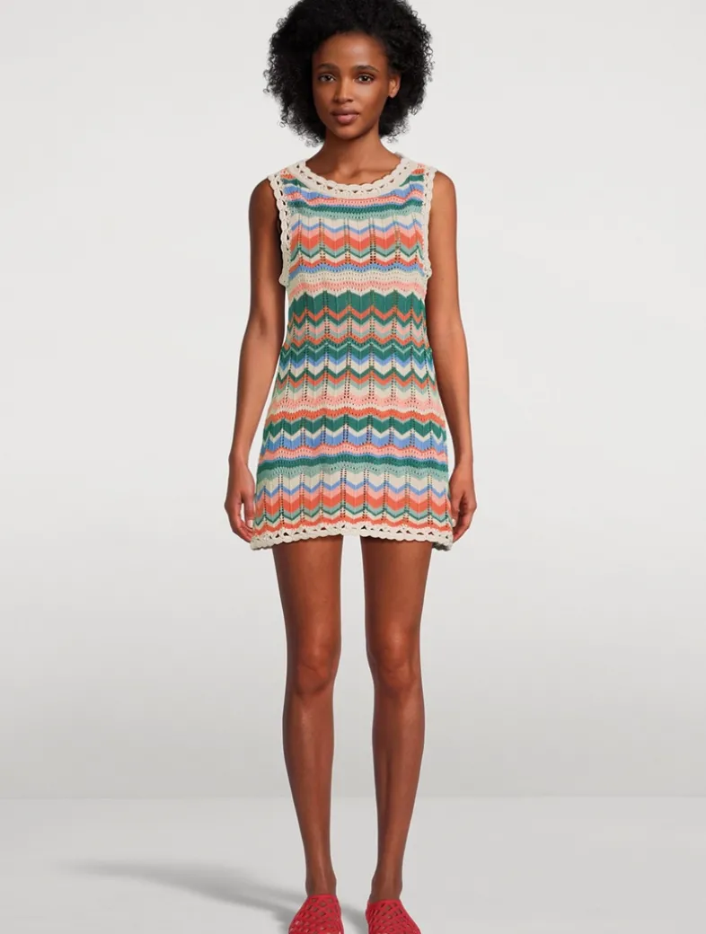 A multicolour chevron pattern lends a graphic touch to this sleeveless mini dress. Knit from a cotton blend in an open-weave crochet construction, edged with scalloped trim.