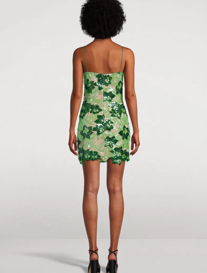 This embellished mini dress is framed by slim straps and finished with a scalloped hem. It features a medley of two-tone floral sequins over a chiffon lining.