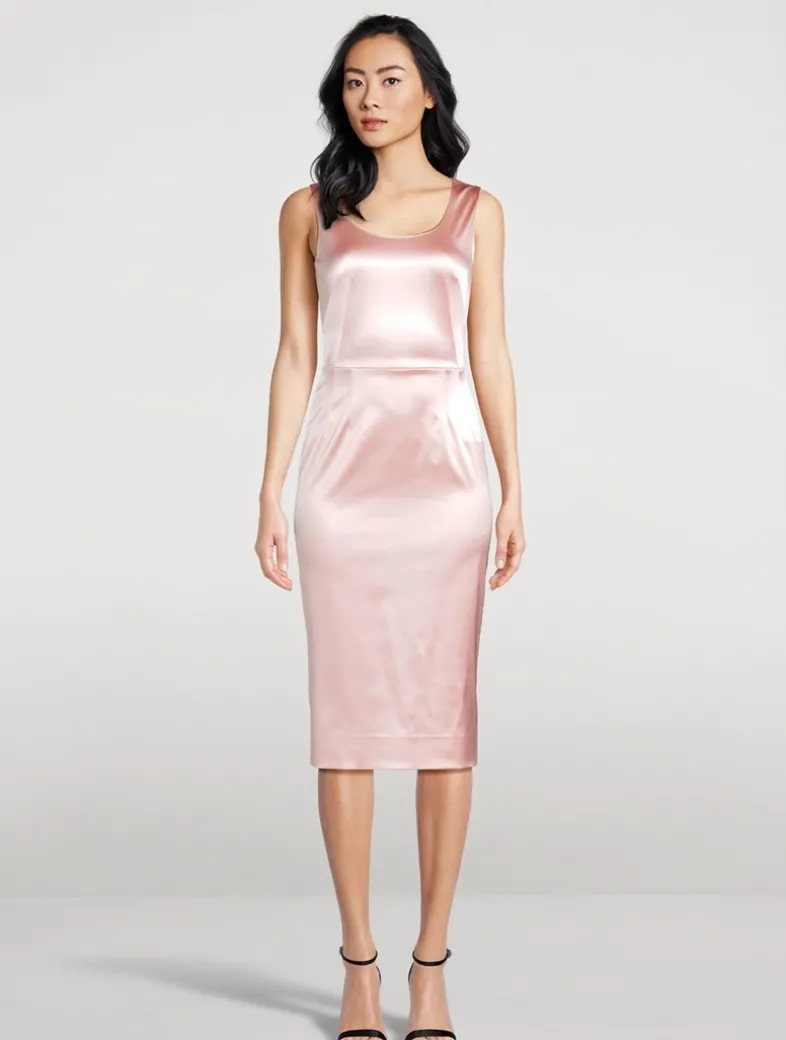 Cut in Dolce’s signature shift silhouette, this sleeveless midi dress is crafted from a high-shine satin with the perfect amount of stretch to hug your curves.