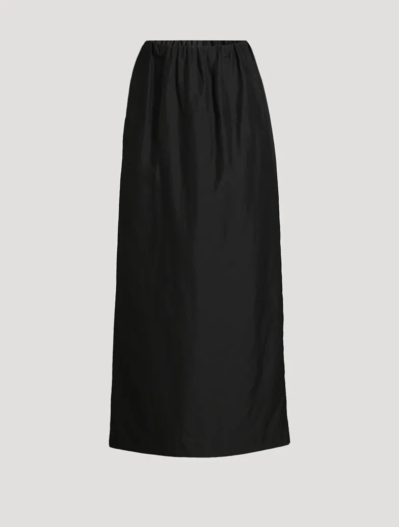 A minimal floor-length skirt made in woven cotton and silk voile. Featuring a slightly flared fit, this maxi skirt is finished with a gathered elastic waistband, singe back vent, and side seam pockets.