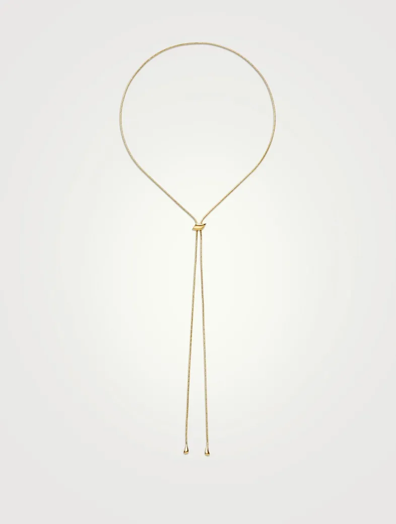 This statement snake chain lariat necklace features two droplet pendants with a matte and high shine finish, as well as an adjustable signature Savi ‘S’ slider for added versatility. Wear your way as a choker or as a medium necklace.