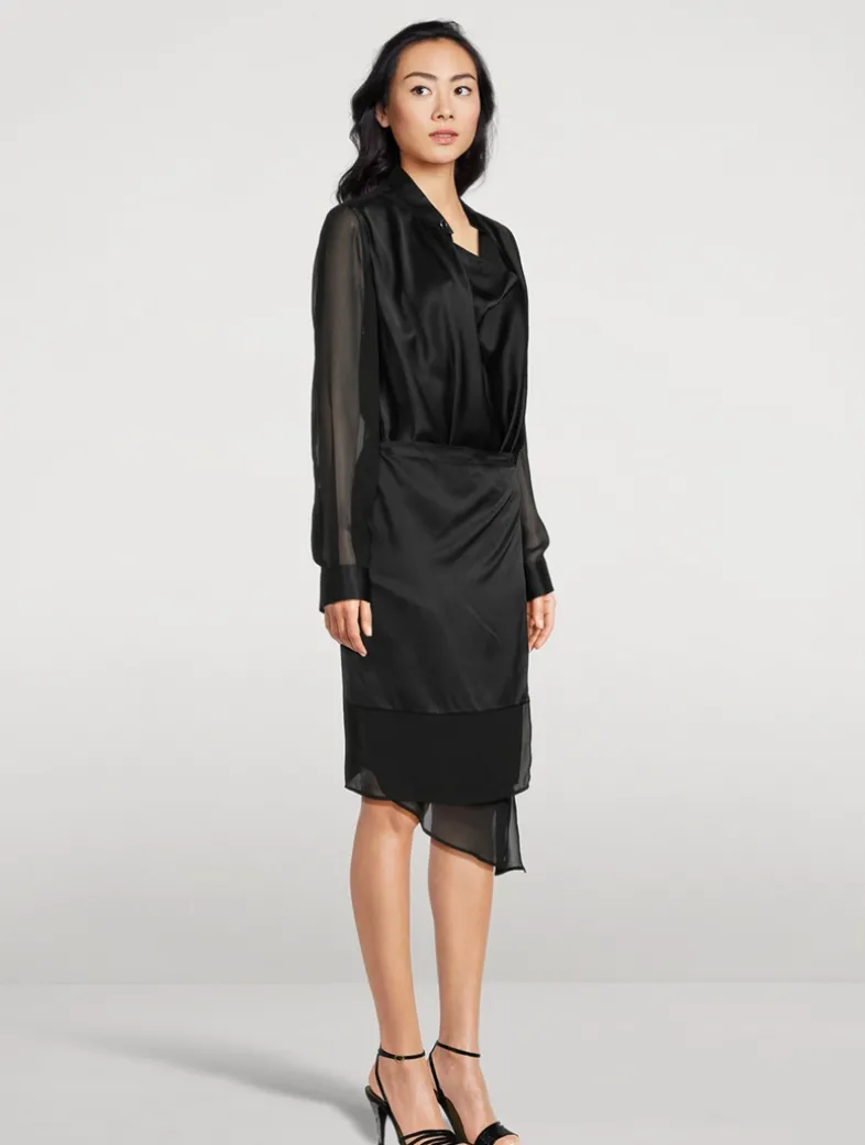 Crafted from luxe silk, this shirt dress is designed with long sheer sleeves, a geometric back panel, and a handkerchief hem. Open the collar to reveal a draped cowl neckline.