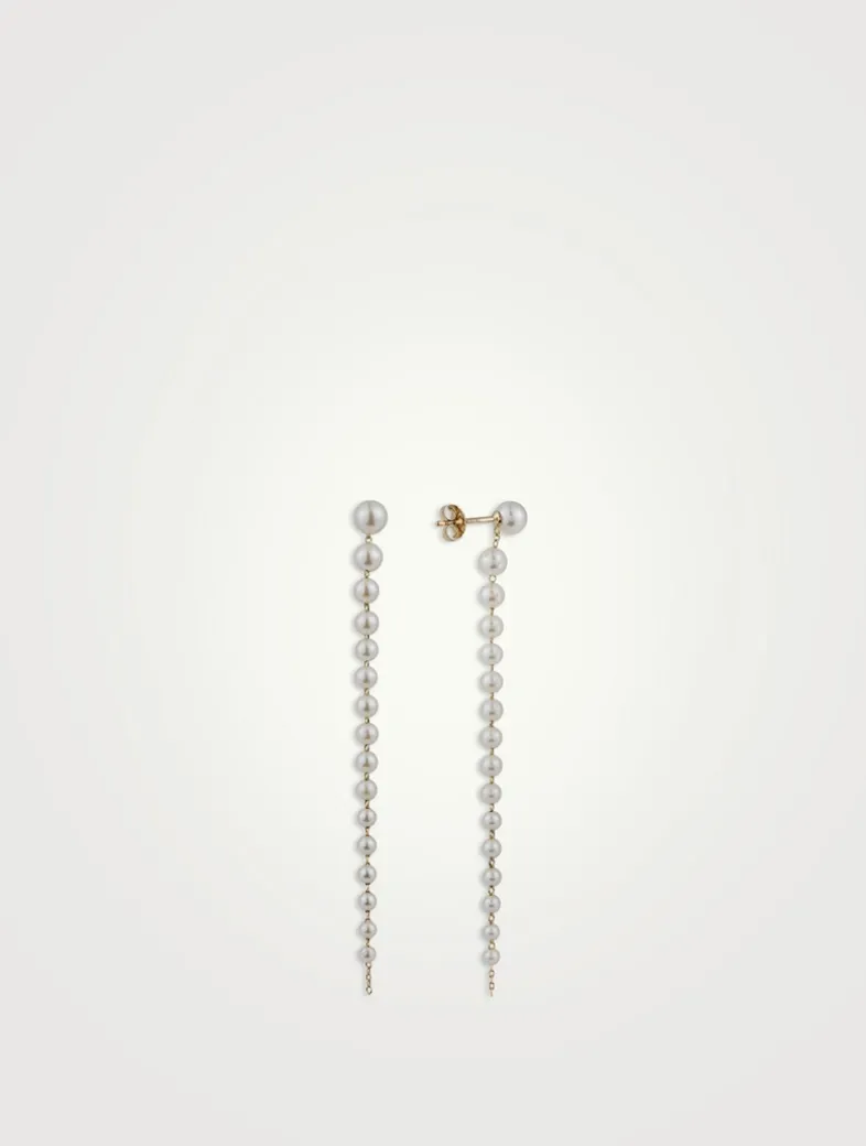 Mounted on 14k gold post backings, these drop earrings feature a line of cascading Akoya pearls on a gold chain, offering fluid movement.