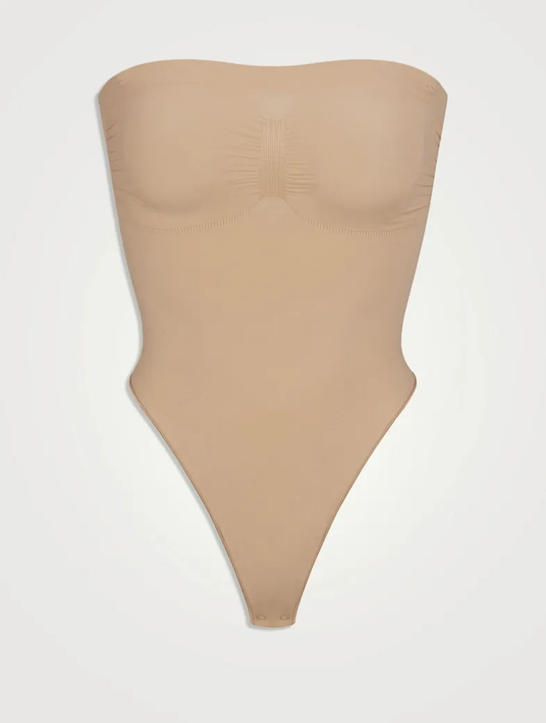 Cinch your waist and sculpt your tummy and core in this perfectly compressive strapless thong bodysuit. Wear it your way with removable adjustable straps that convert to shoulder straps, cross-back, or halter-style. Features silicone bands along the top and bottom to stay in place, center front and side stitching to define and support your bust, and a cotton gusset with snap closure. Fits true to size.
