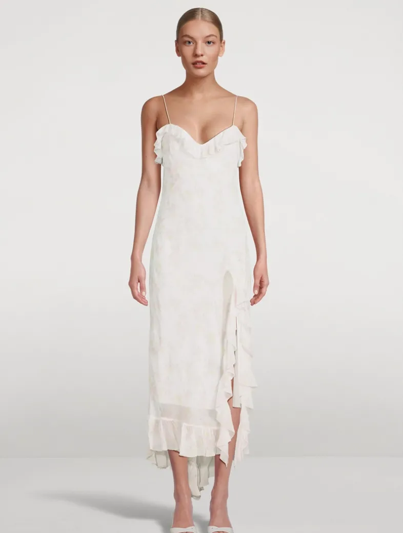 This slinky slip dress is embellished with fluttering ruffles along the neckline, hem, and side slit. It is printed with a faded floral motif, enhancing its romantic elegance.
