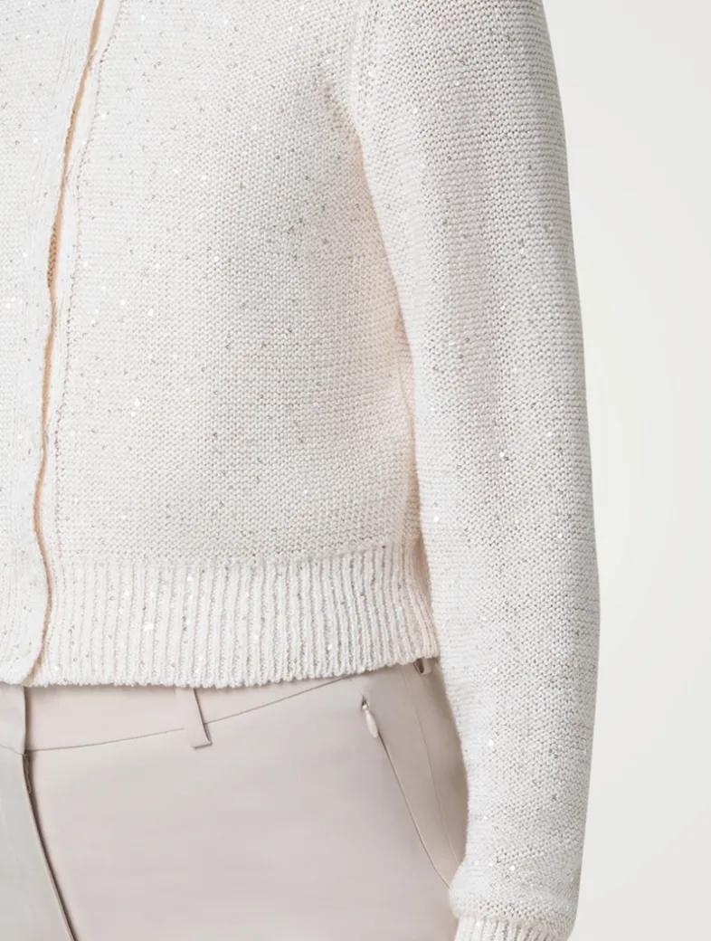 This knit cardigan from Akris is the perfect blend of casual and formal. Crafted from a linen and cotton blend, the design features transparent sequins, contrasting with the simple round neckline and modern, slightly cropped fit.