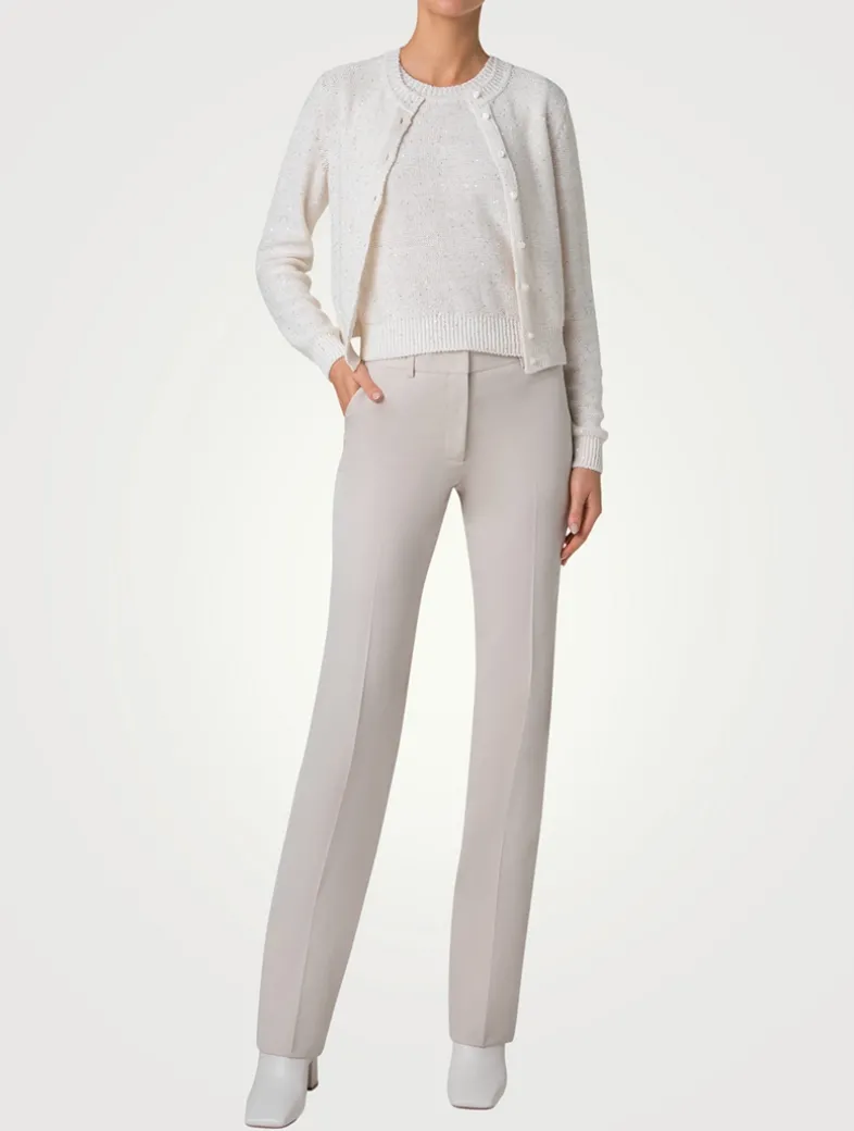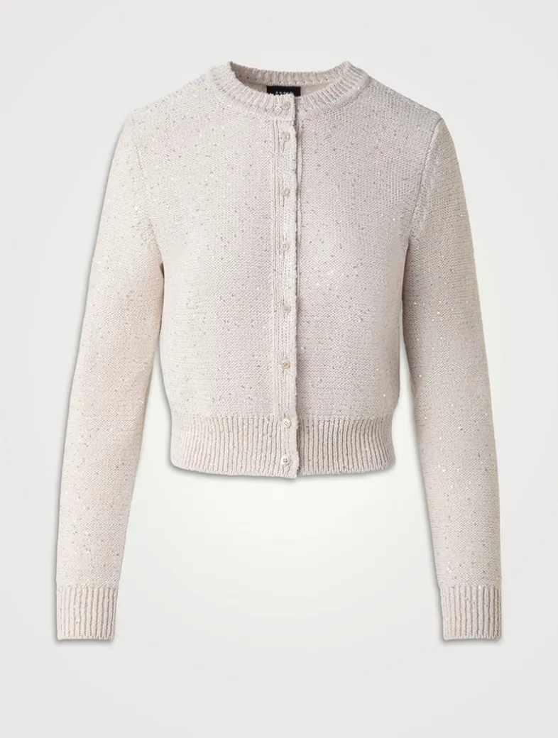 This knit cardigan from Akris is the perfect blend of casual and formal. Crafted from a linen and cotton blend, the design features transparent sequins, contrasting with the simple round neckline and modern, slightly cropped fit.