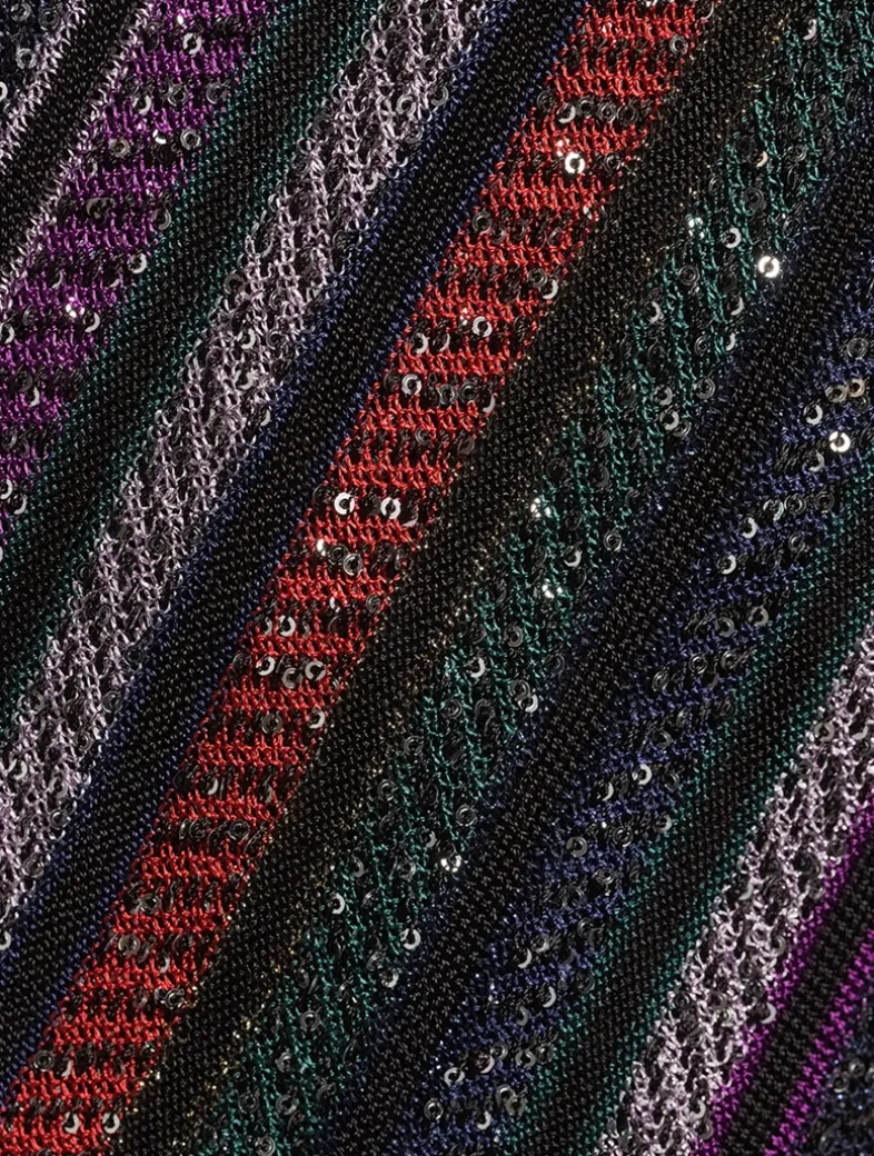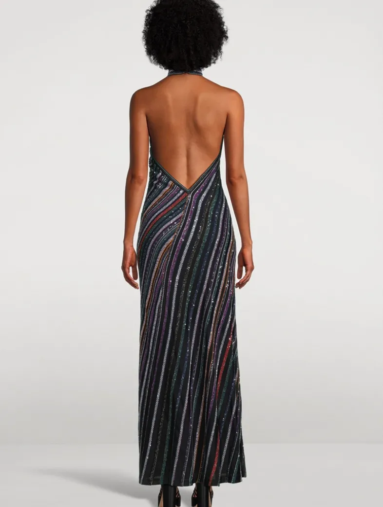 Crafted from the brand’s signature knit fabrication, this ankle-grazing gown is illuminated by a shower of applied sequins and diagonal stripes. It has a vintage-inspired look with a high halter neckline and a backless design.