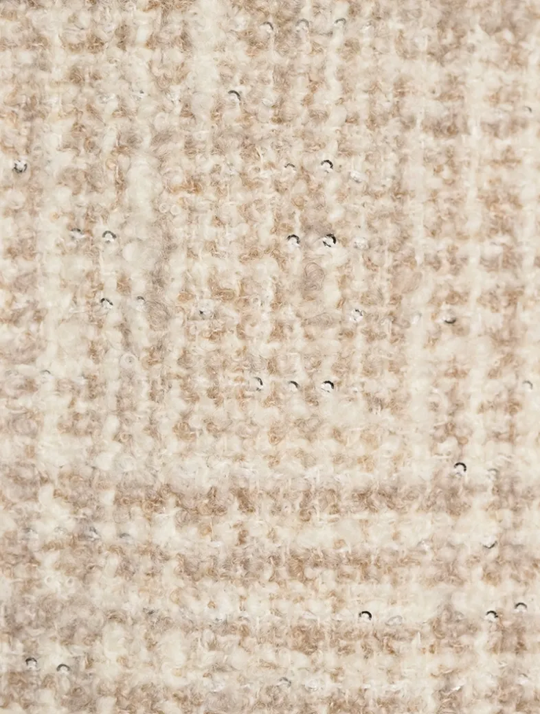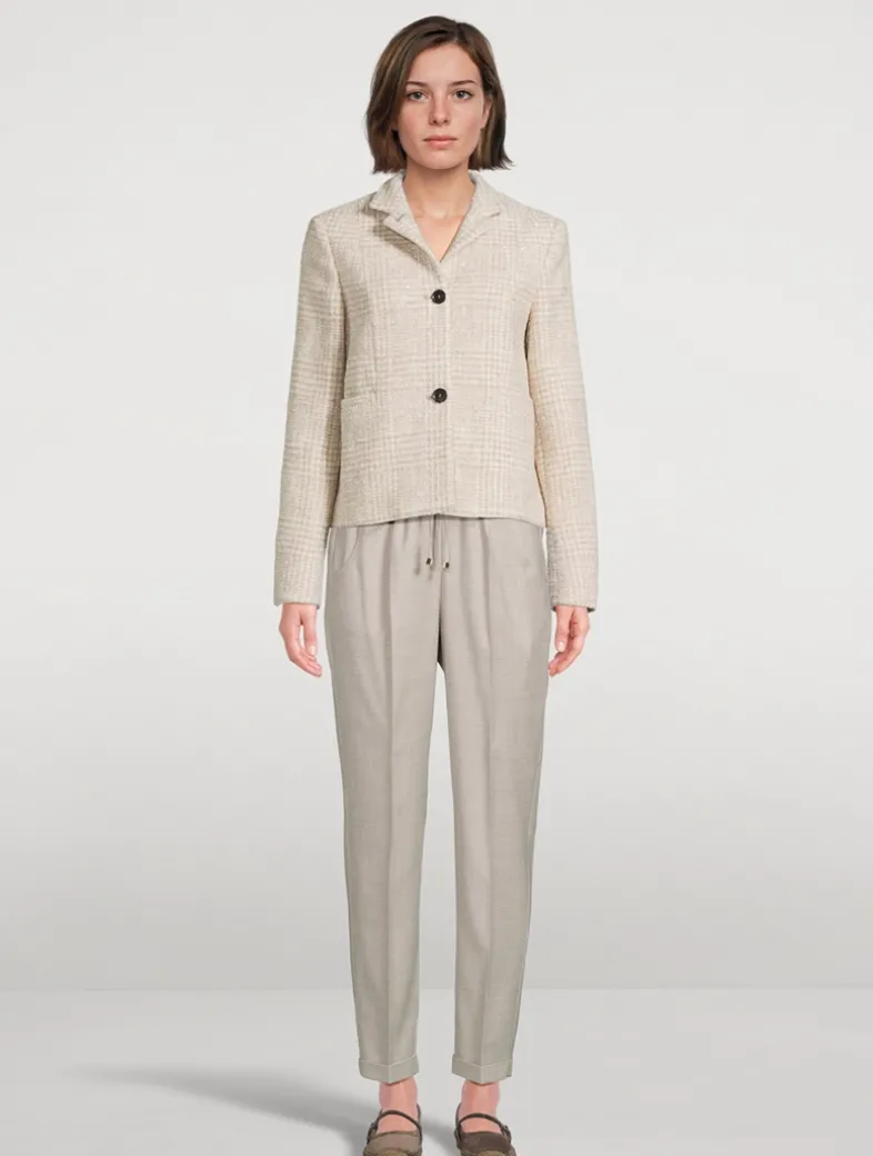 Lined with silk and crafted from a luxurious wool and alpaca blend with a hint of stretch, this classic plaid jacket is embellished with shimmering sequin embroidery throughout. A high stance and patch pockets complete the look.