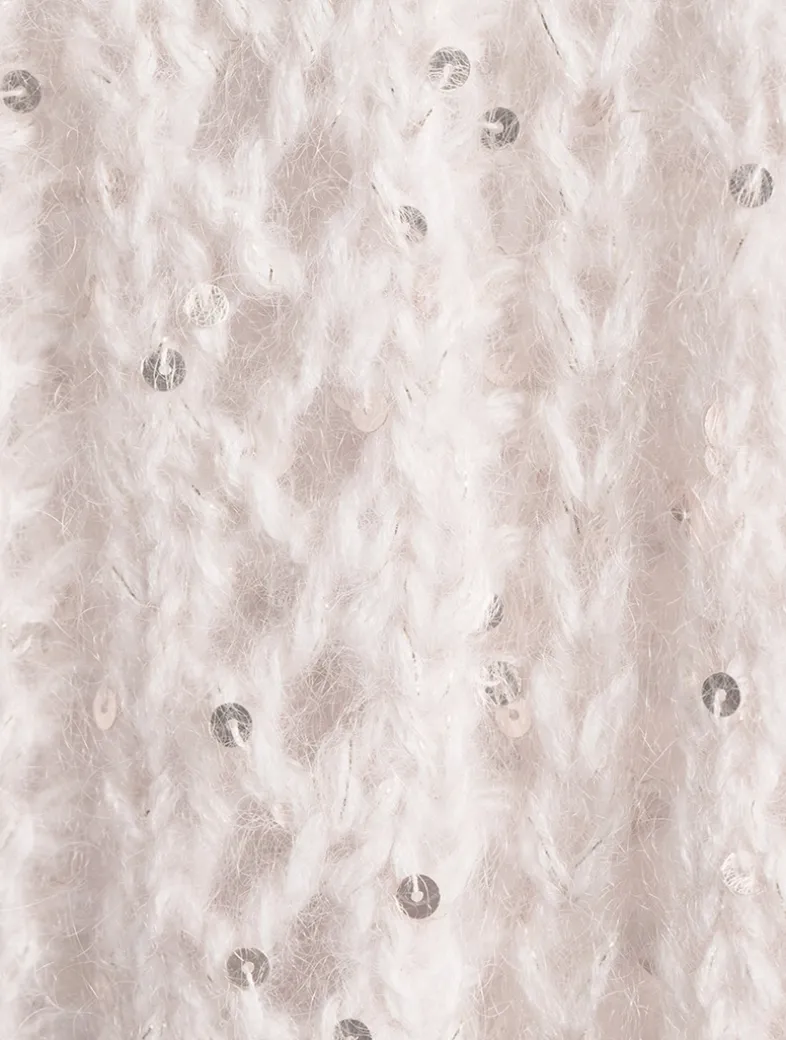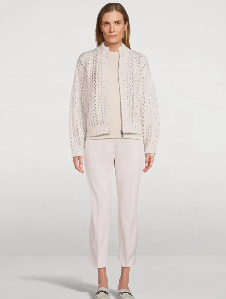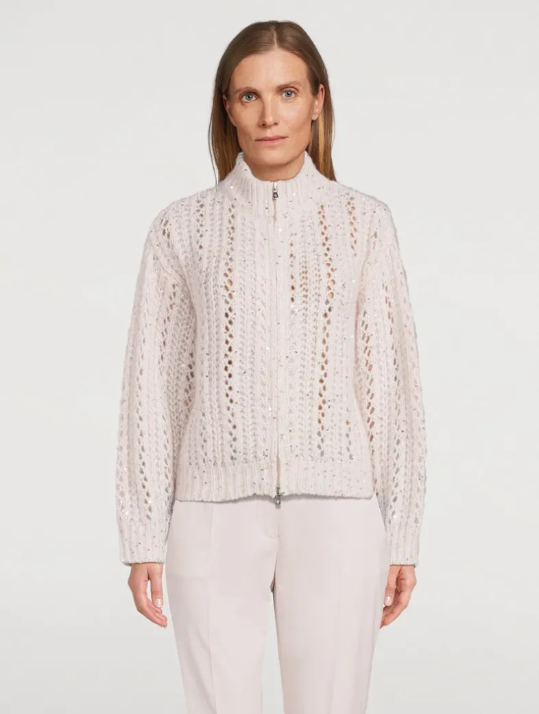 This open-weave knit has loads of feminine appeal thanks to the sparkling sequins that adorn every inch. This long-sleeve, zip-front cardi is Italian-made and features a high ribbed collar and hems that give the design a casual appeal.