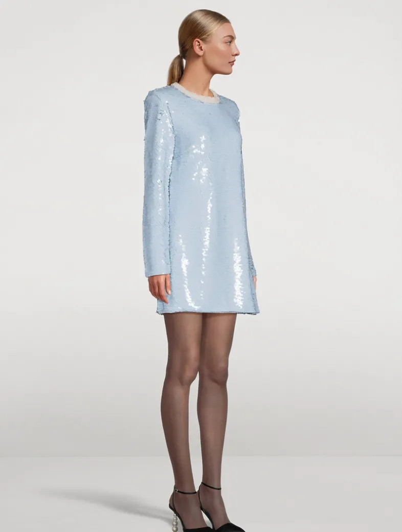 A mini dress in an irresistibly flattering silhouette, adorned with liquid-like sequins that add a sparkling touch. The fitted, fully lined design is finished with an elegantly embellished neckline and long sleeves.