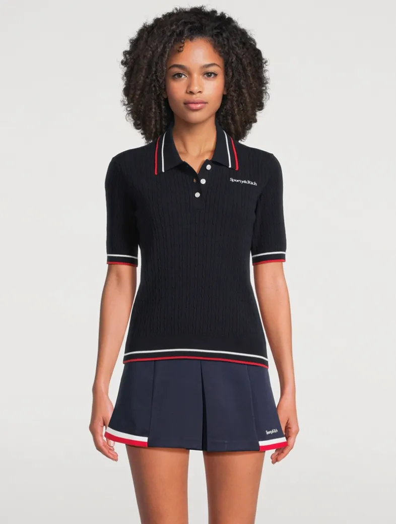 This short-sleeve polo has a lightweight knit construction with a delicate cabled texture. It is edged with striped trim at the collar, cuffs, and hem, and finished with a petite embroidered monogram at the chest.