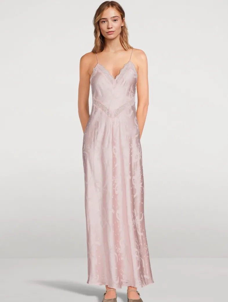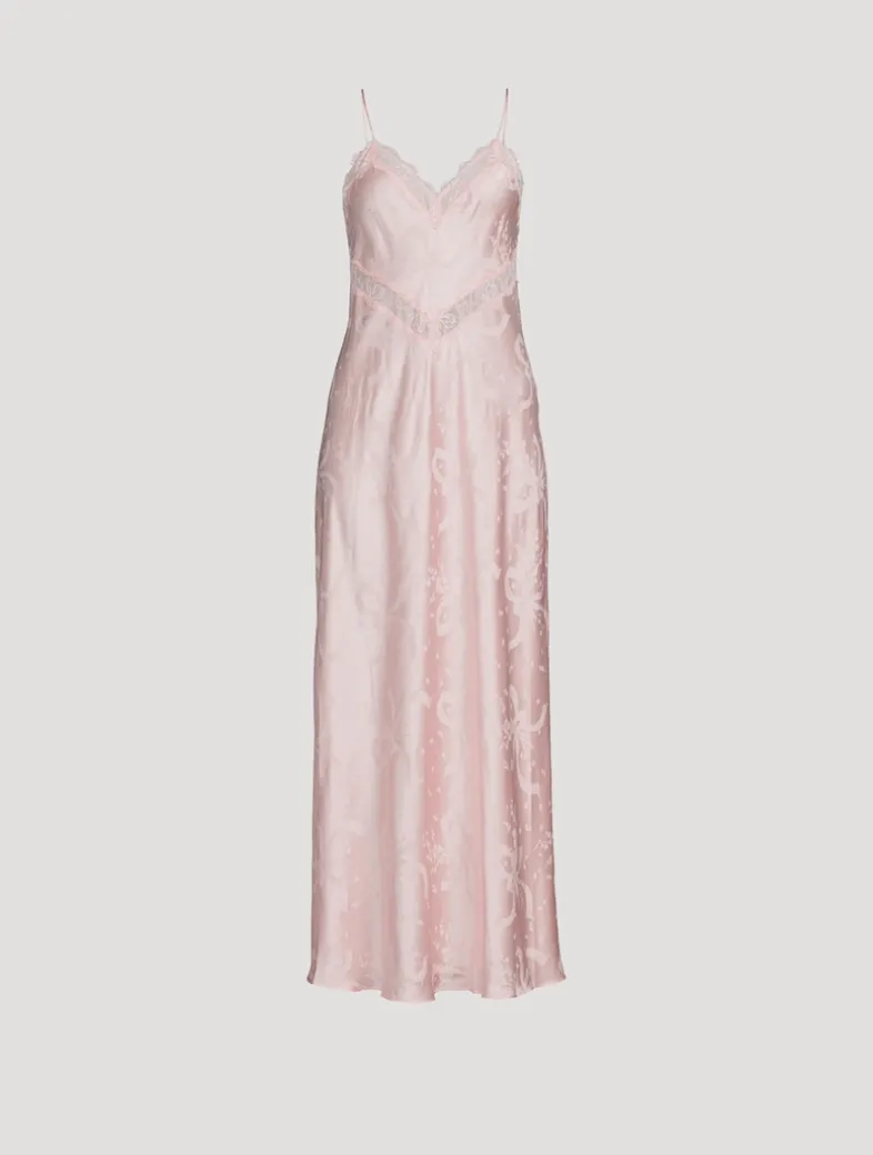 The Serita is back and flirtier than ever. This time, she arrives in a silk charmeuse jacquard fabric, giving it a drapey, yet elevated wear. The stunning slip dress features delicate contrasting lace at the neckline and waist. The lace is backed with a bit of chiffon for a seductive finish.