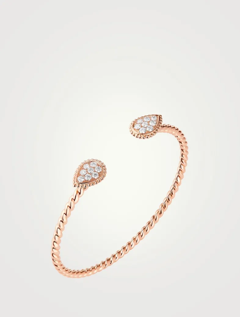 A sculpted chain twists voluptuously around the wrist. Here is a slightly open bangle bracelet, on which two pavé diamond Serpent Bohème drops are placed.