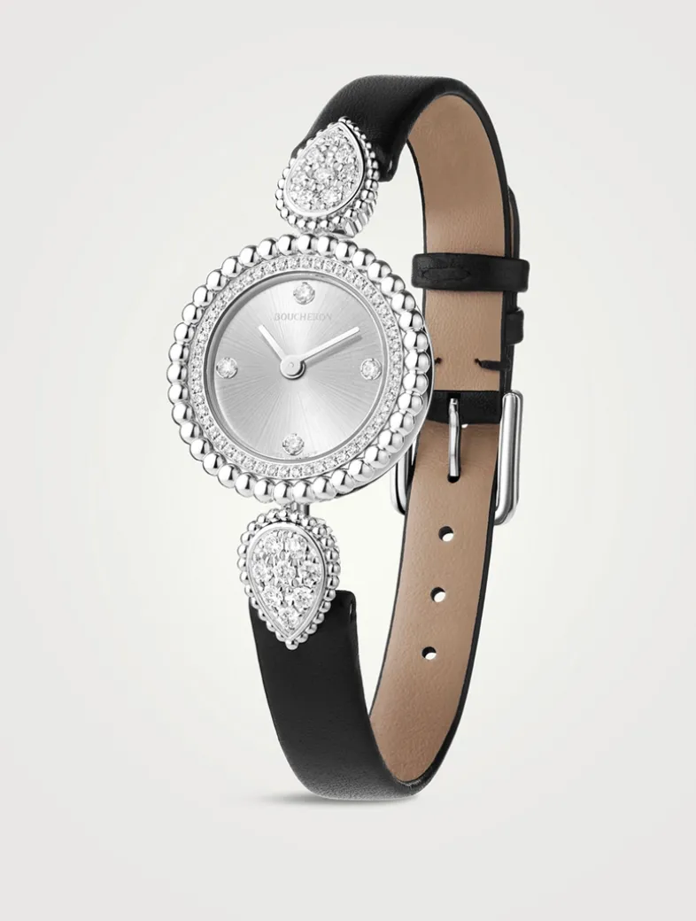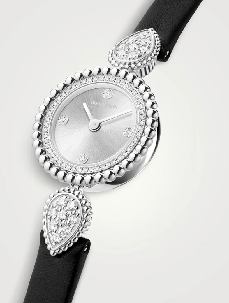 The Serpent Bohème watch combines jewellery expertise and watchmaking precision, featuring a case highlighted by two rows of light: a first row of round diamonds and a second of polished white gold beads. Two diamond-paved drops punctuate the Serpent Bohème effect. The sunbrushed decoration of the dial adds character to the four diamond hour-markers.