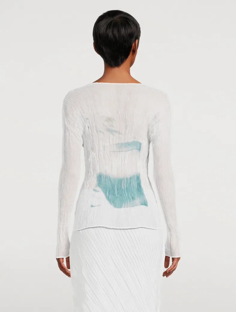 Shadow Study Chiffon Twist are sheer, finely hand-pleated tops adorned with a striking pattern of overlapping black and white film photographs capturing the shadows of everyday objects. This long-sleeved shadow top has a slim fit and a round neckline.