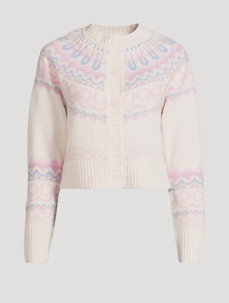 The Shantae Cardigan is a charming Nordic-inspired piece featuring a faux Fair Isle pattern with LoveShackFancy’s signature bow design throughout. This cute, shrunken cardigan has raglan seams for a relaxed fit and is finished with the brand’s custom faux shell buttons.