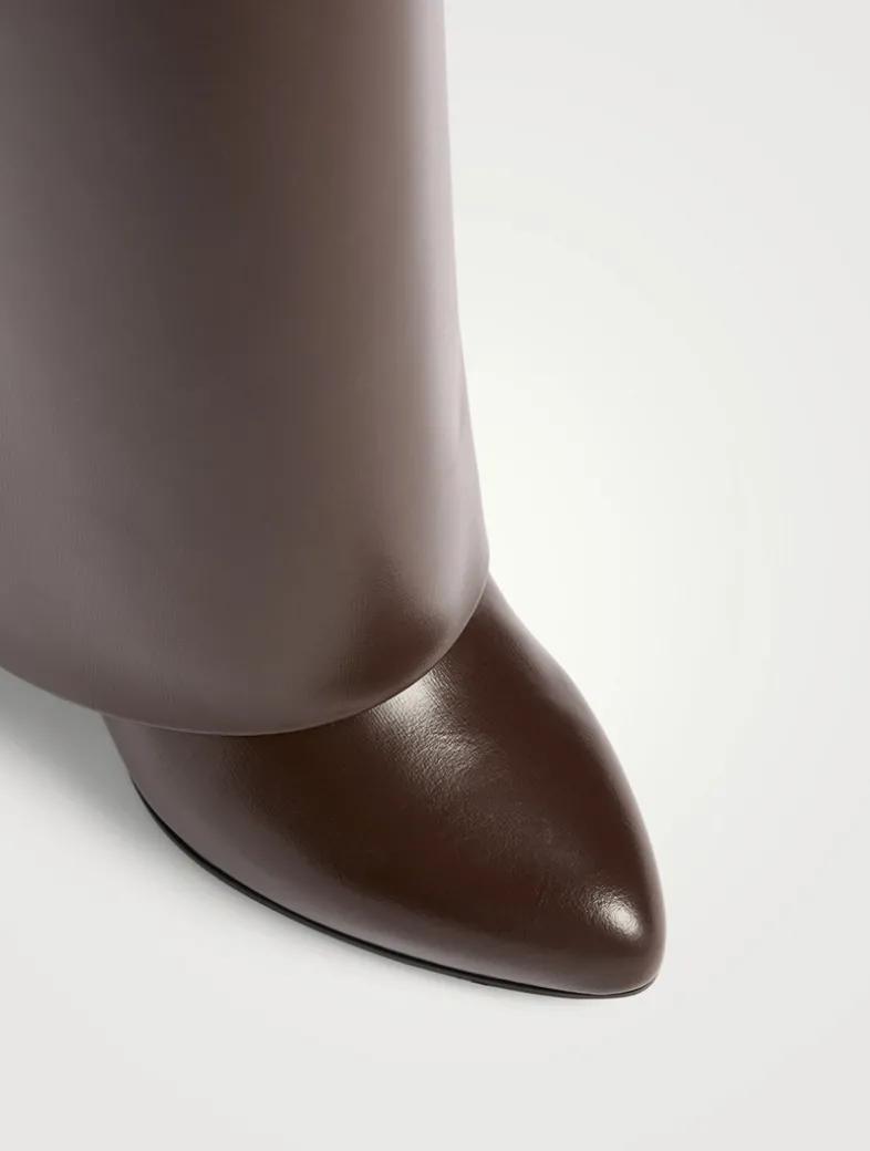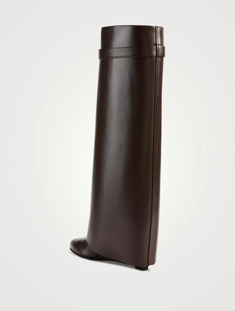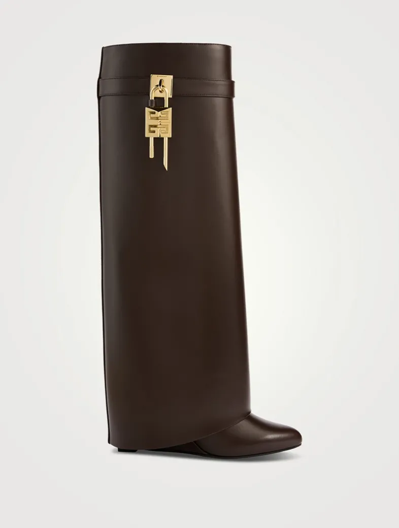 Part of Givenchy’s iconic Shark Lock line, these boots are crafted in smooth calfskin leather and set on a wedge heel. A leather band around the shaft features a branded metal clasp and 4G padlock on the right side and branded padlock on the left one.