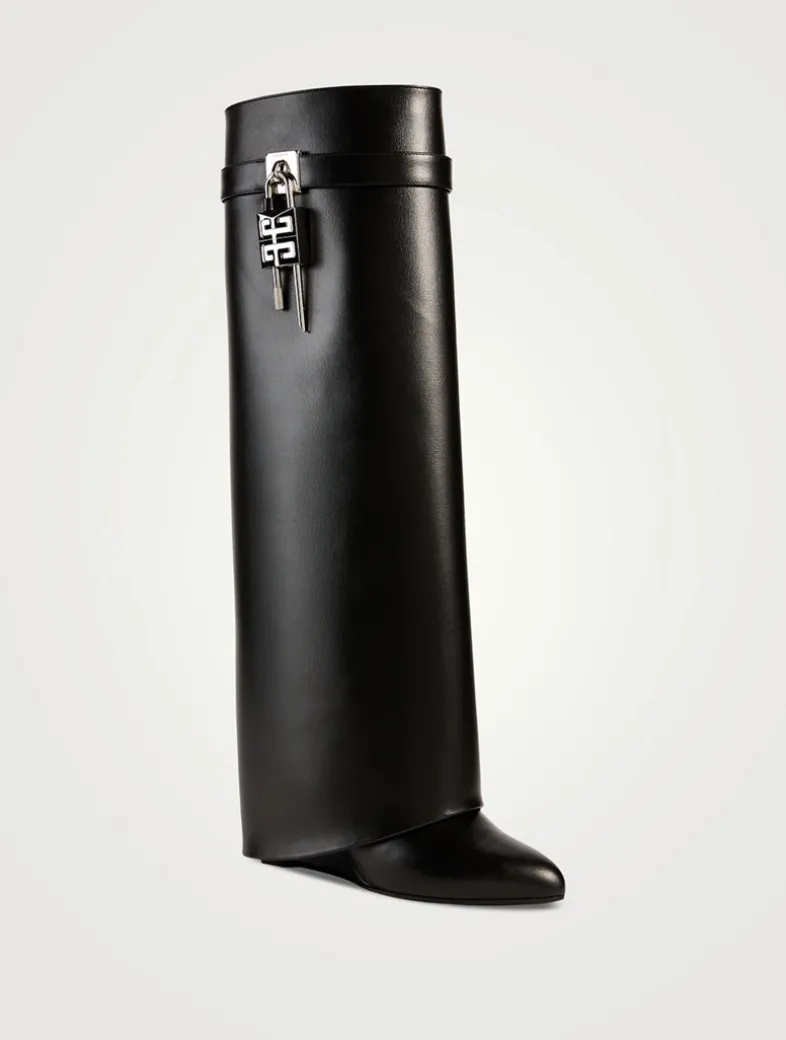 Part of Givenchy’s iconic Shark Lock line, these boots are crafted in smooth calfskin leather and set on a wedge heel. A leather band around the shaft features a branded metal clasp and 4G padlock on the right side and branded padlock on the left one.
