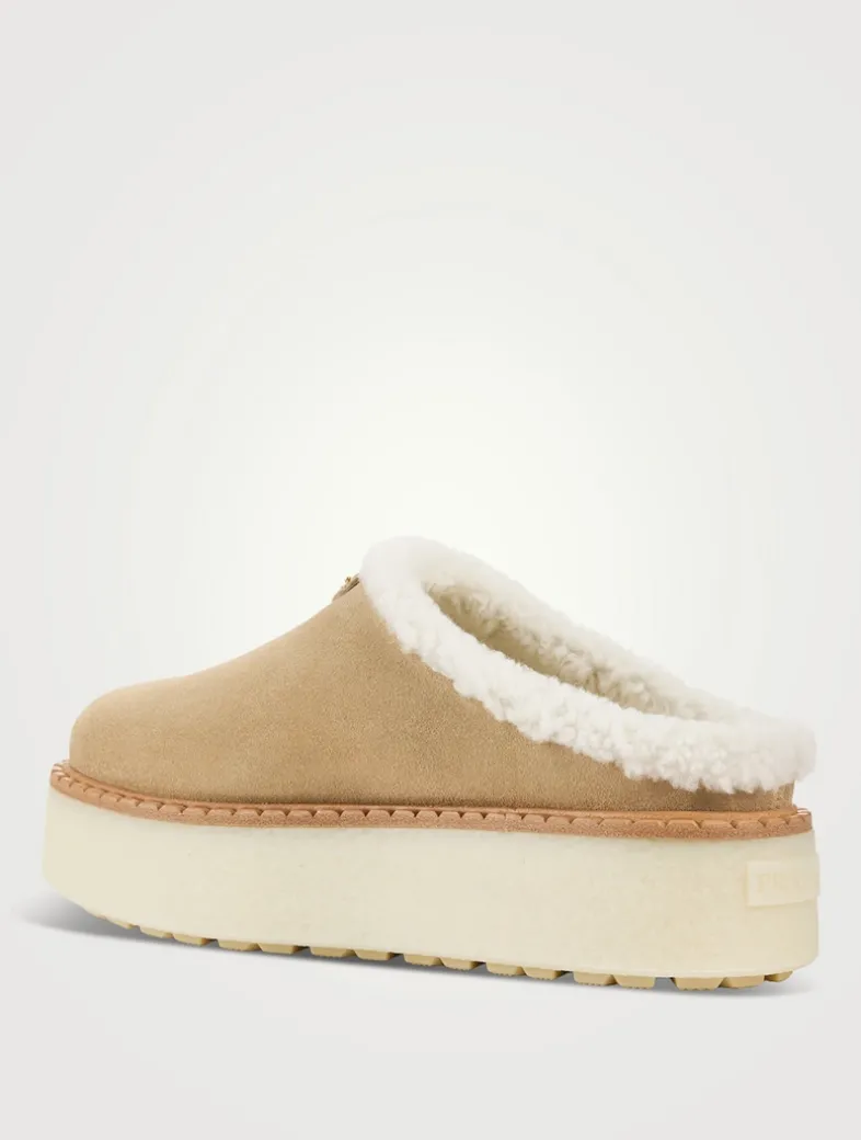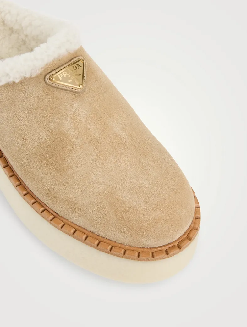 Lined with ultra-cozy shearling, these plush suede slip-ons are an elevated take on a comfortable staple. They are set on a platform crêpe sole and finished with Prada’s signature triangle logo.