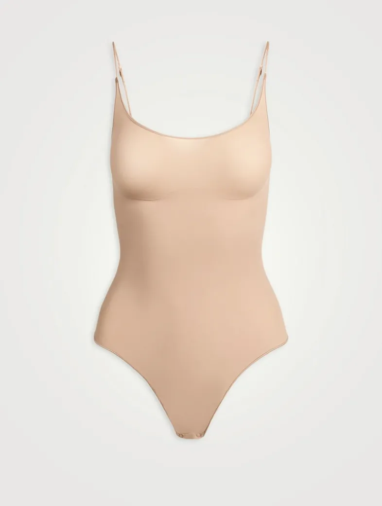 Summer-ready support. This scoopneck, thong bodysuit is designed in SKIMS’ lightweight, smoothing fabric for mid-level compression at the core. The perfect warm weather layer, this sheer solution is designed with thin, adjustable straps. Complete with snaps at the gusset and fits true to size.