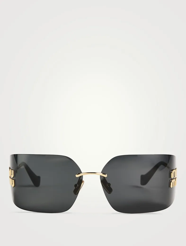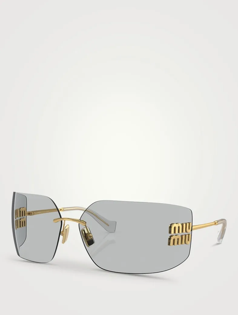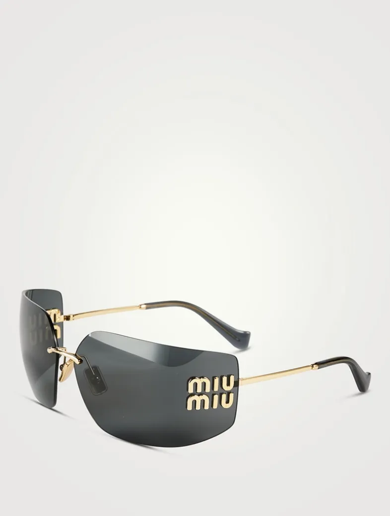 A statement pair, these ultra-light rimless sunglasses are characterized by curved lenses with vertical Miu Miu logo embellishment.