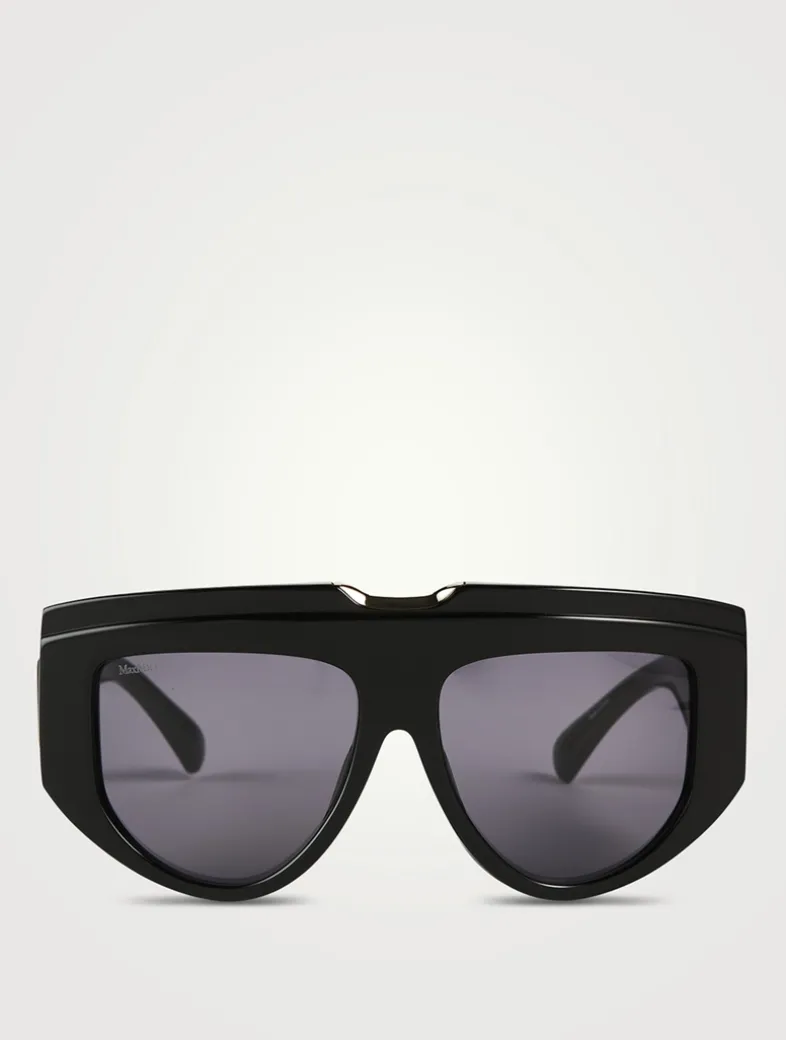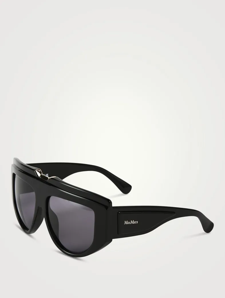 Designed with a large front, extra-bold logo temples and daring volumes, these acetate sunglasses have a geometric, wrap-around shape. The metal detailing on the bridge marks the collection.
