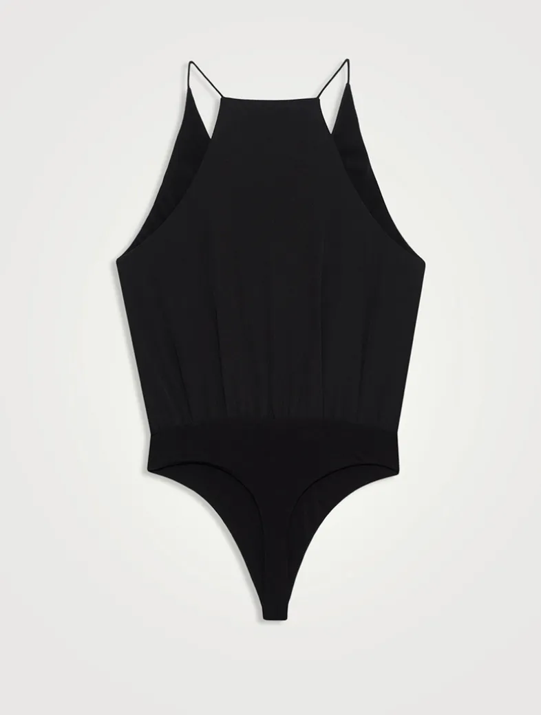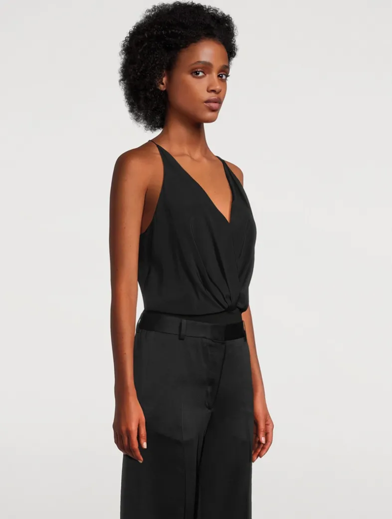 Crafted from a substantial 23mm silk crepe with a lustrous yet matte texture and a viscose-jersey bottom, this versatile one-piece is fully lined and features a deep V-neckline, draping across the front secured by a loop and thread hook closure at the bust. Finished with thin spaghetti straps, a thong back, and double snap-button closure at its base. Cut for a loose fit that billows at the waist.