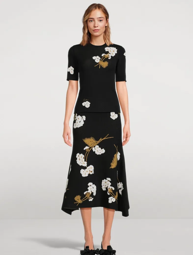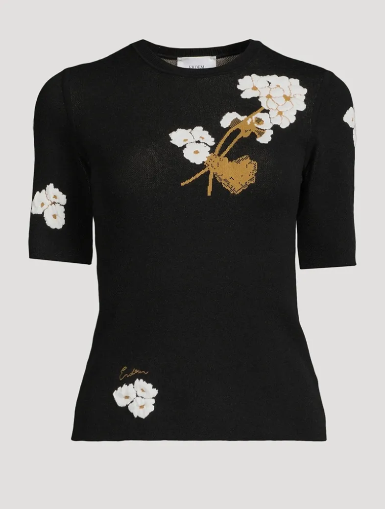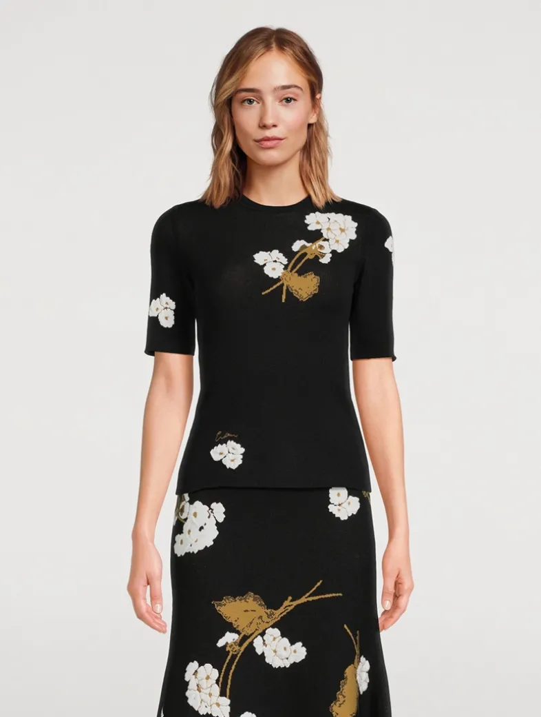 Erdem’s Elena Garden print is realized as a super-fine jacquard knit via this short-sleeve sweater. It has raised, three-dimensional tubular cotton flowers. Wear this fitted style with the matching skirt for the most feminine take