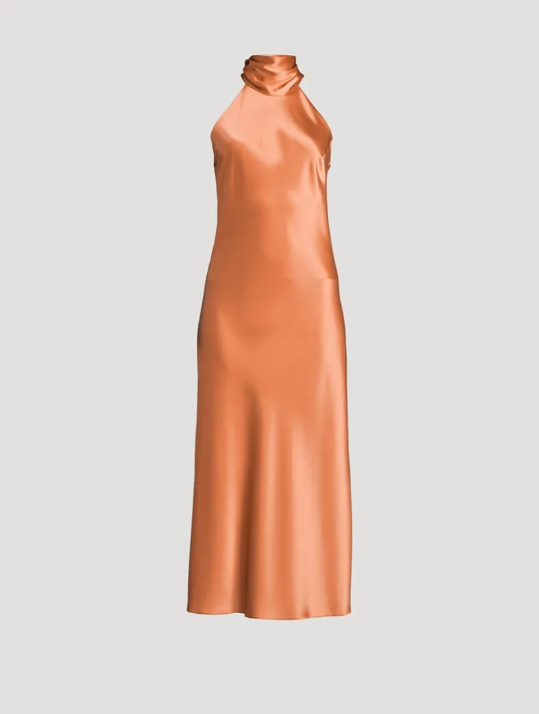 An elegant high neckline and sash-tie detail that drapes down the back, coupled with draped bias-cut satin, defines this elegant cocktail dress.
