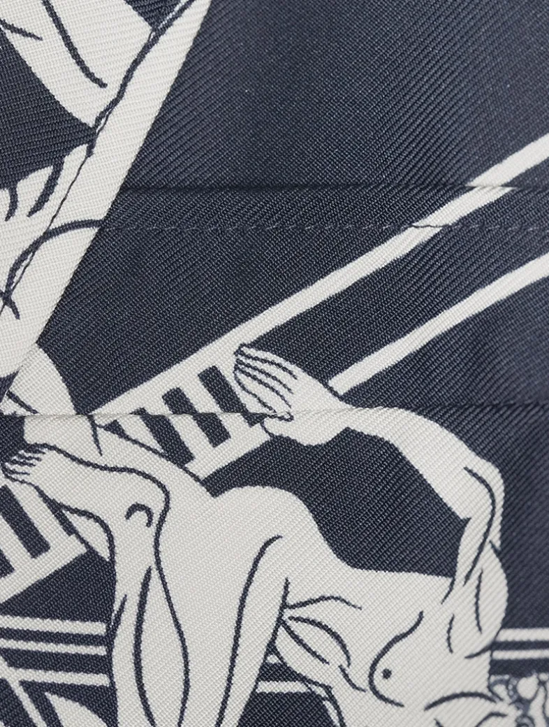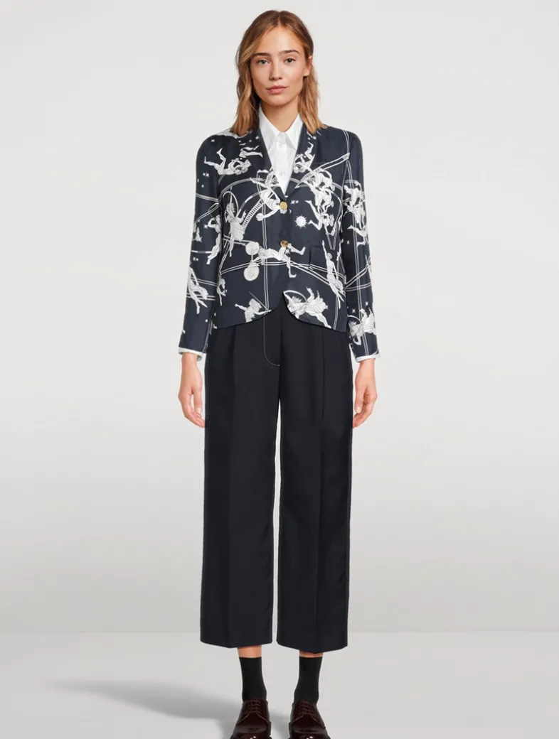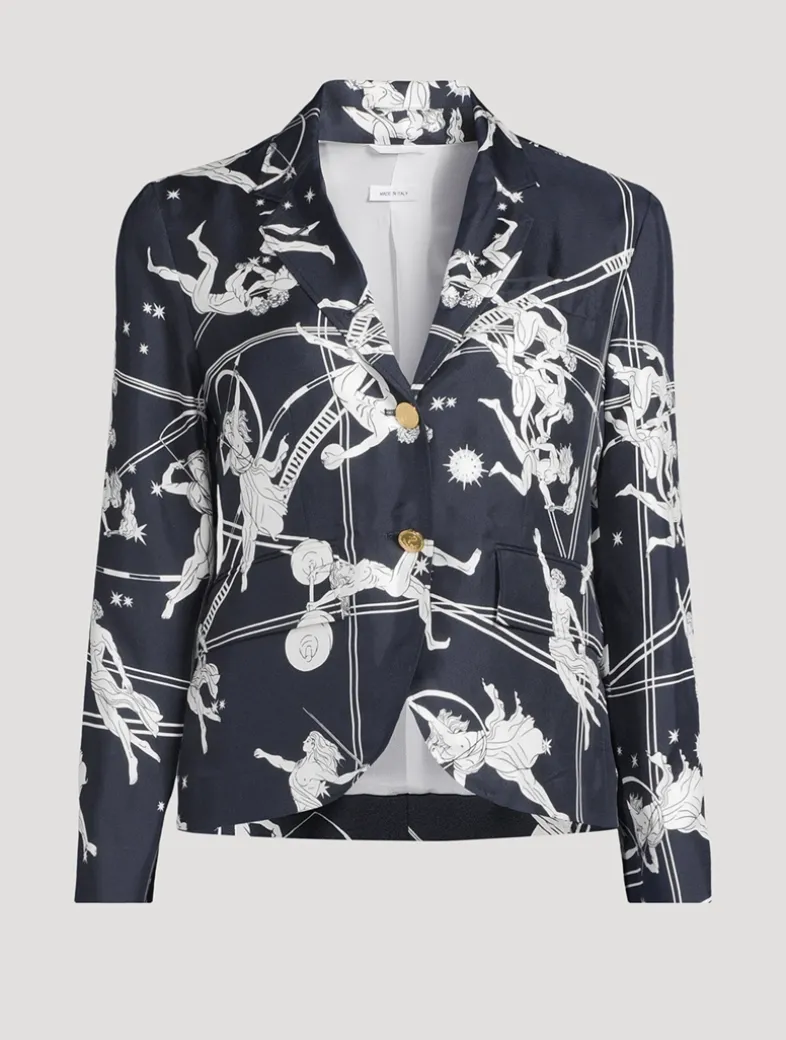 A classic silk blazer receives an Olympic-level upgrade, featuring ancient Grecian athletes competing across the fabric. It is tailored along a slim silhouette with bracelet-length sleeves, single-breasted closure, and flap pockets at the waist.