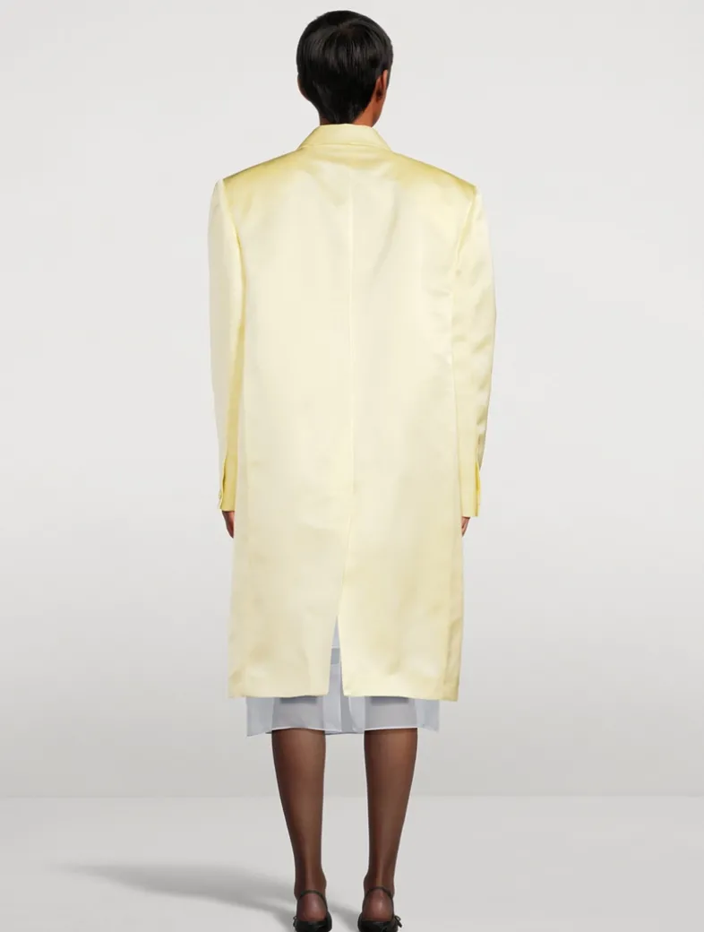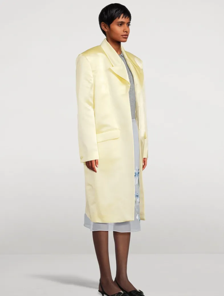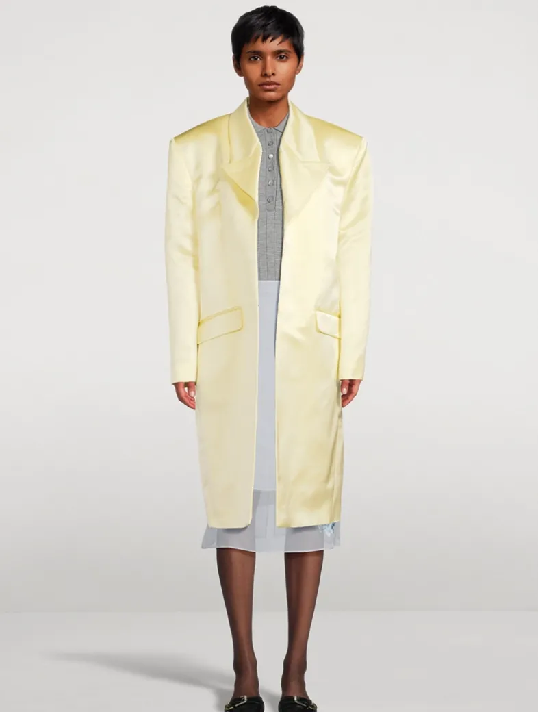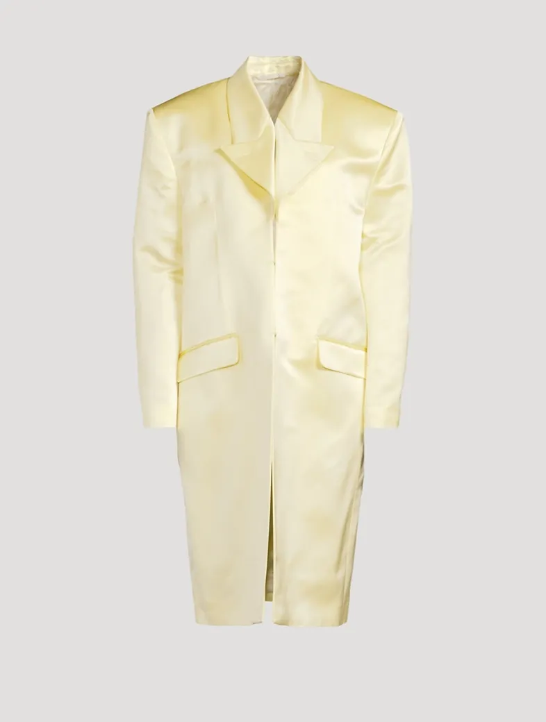Flaunting an ultra-luxe construction, this silk satin duchess coat has a glossy sheen and a 4G-printed satin lining. It is cut in an oversized silhouette with a notched collar and strong padded shoulders. Flap pockets at the waist complete the look.