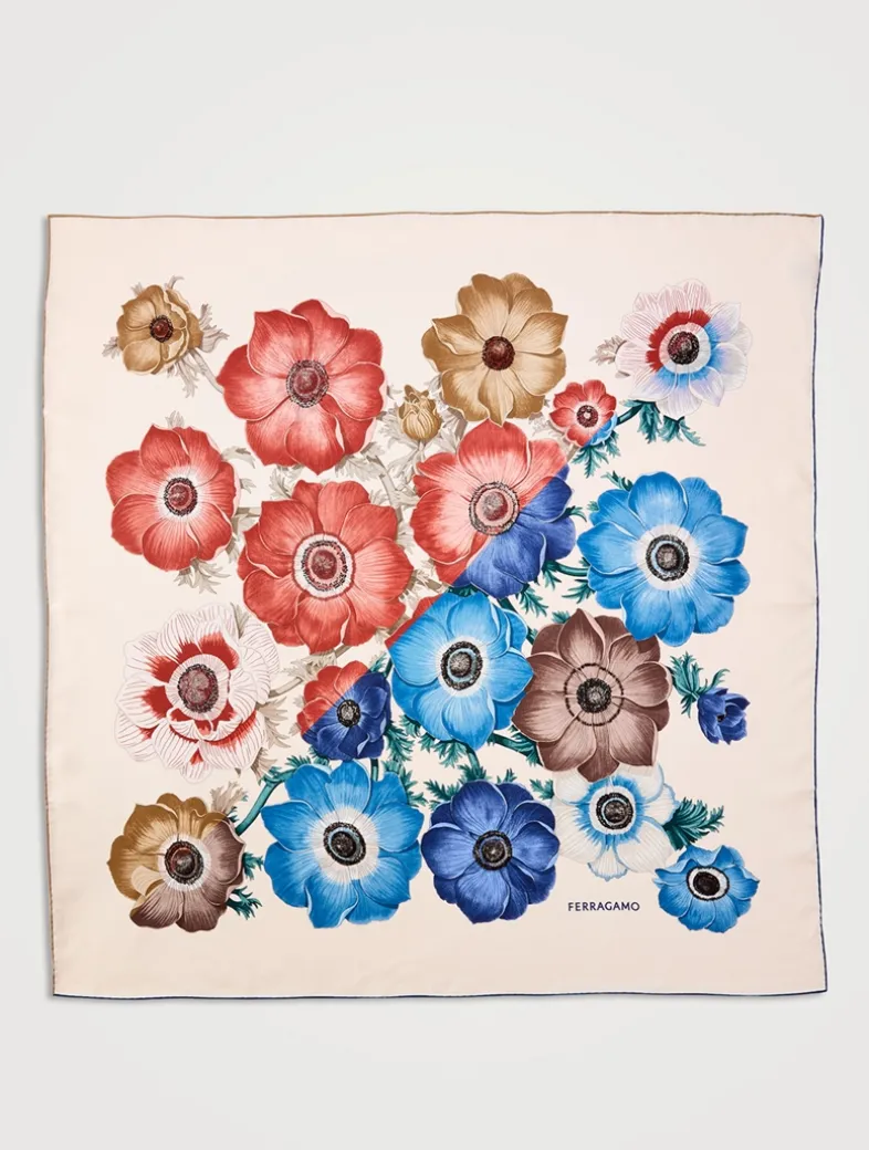 This 100% silk square scarf features The Anemone print, a floral archive pattern. This print is introduced with new proportions and a play of contrasting colors for a romantically hearted motif.