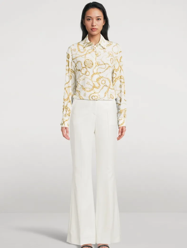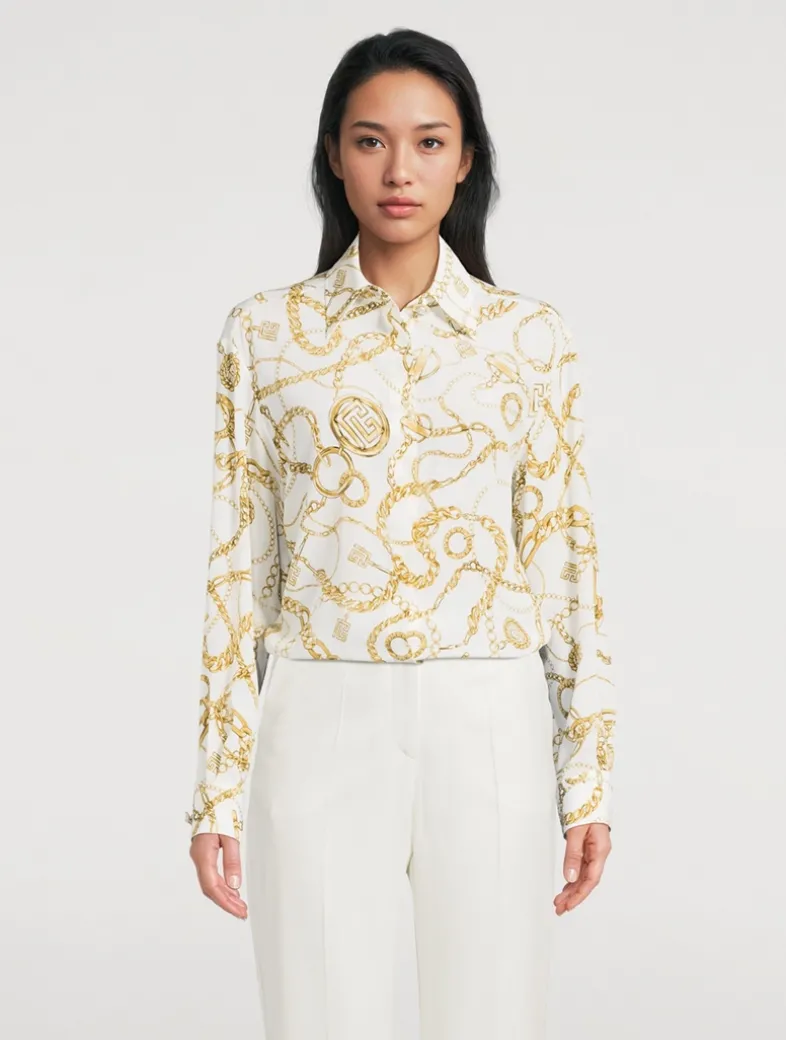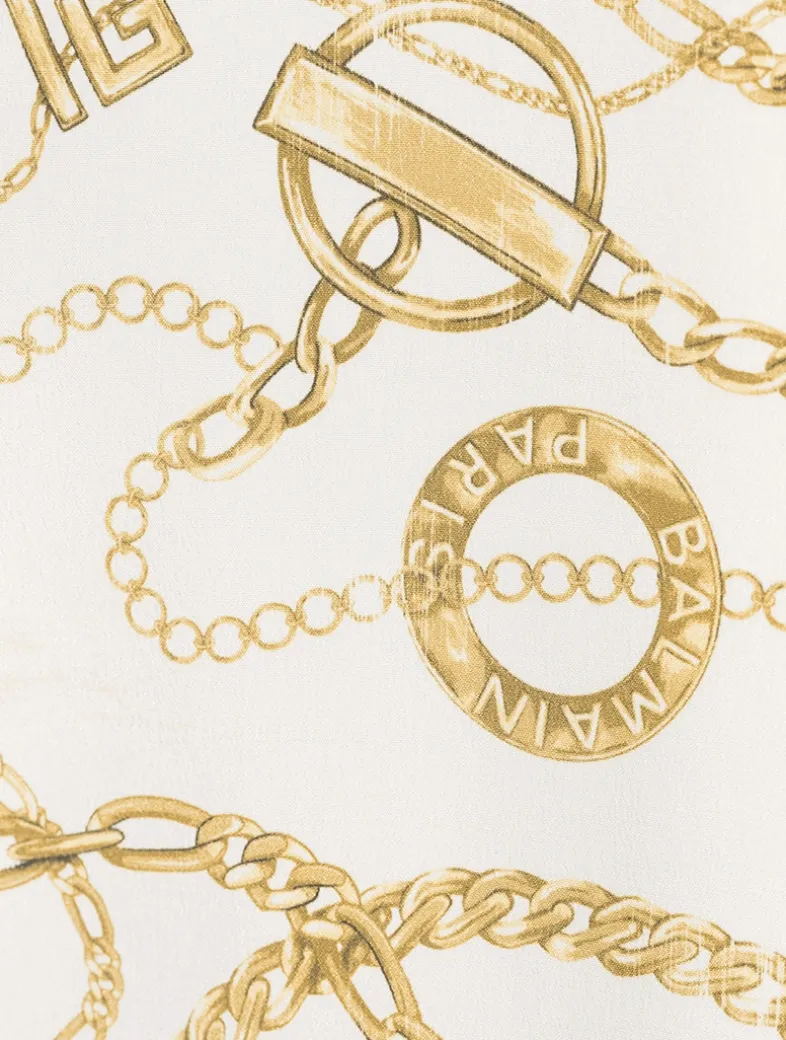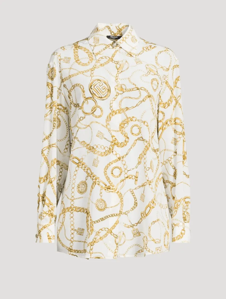 Printed with all-over Balmain Chains pattern, this elegant silk shirt is cut to a fluid silhouette with long sleeves and a pointed collar. Embellished with metal “Gold and Gold Coin” buttons.