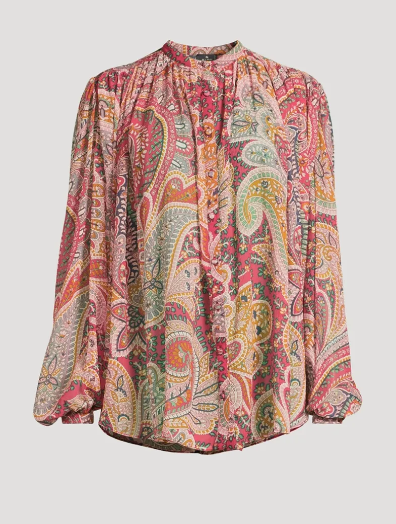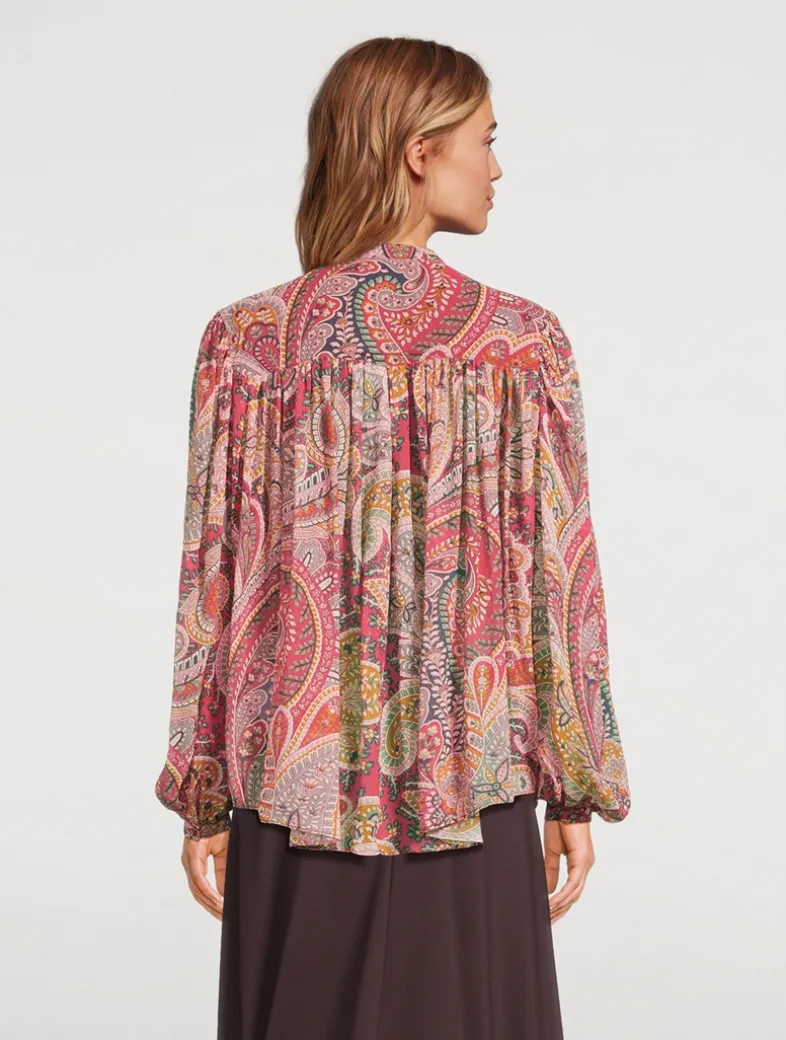 This button-down shirt is crafted from luscious silk and cut to a relaxed silhouette with long puff sleeves. It is printed with a, large-scale paisley motif.