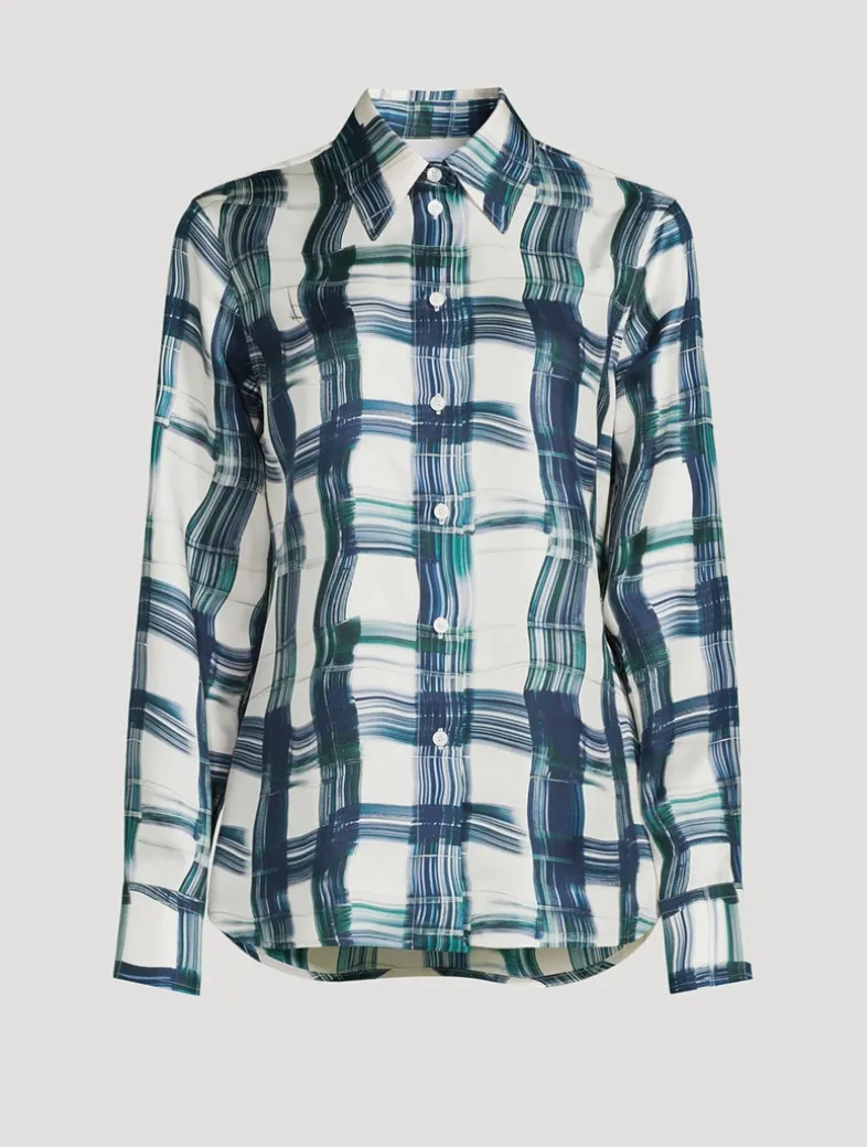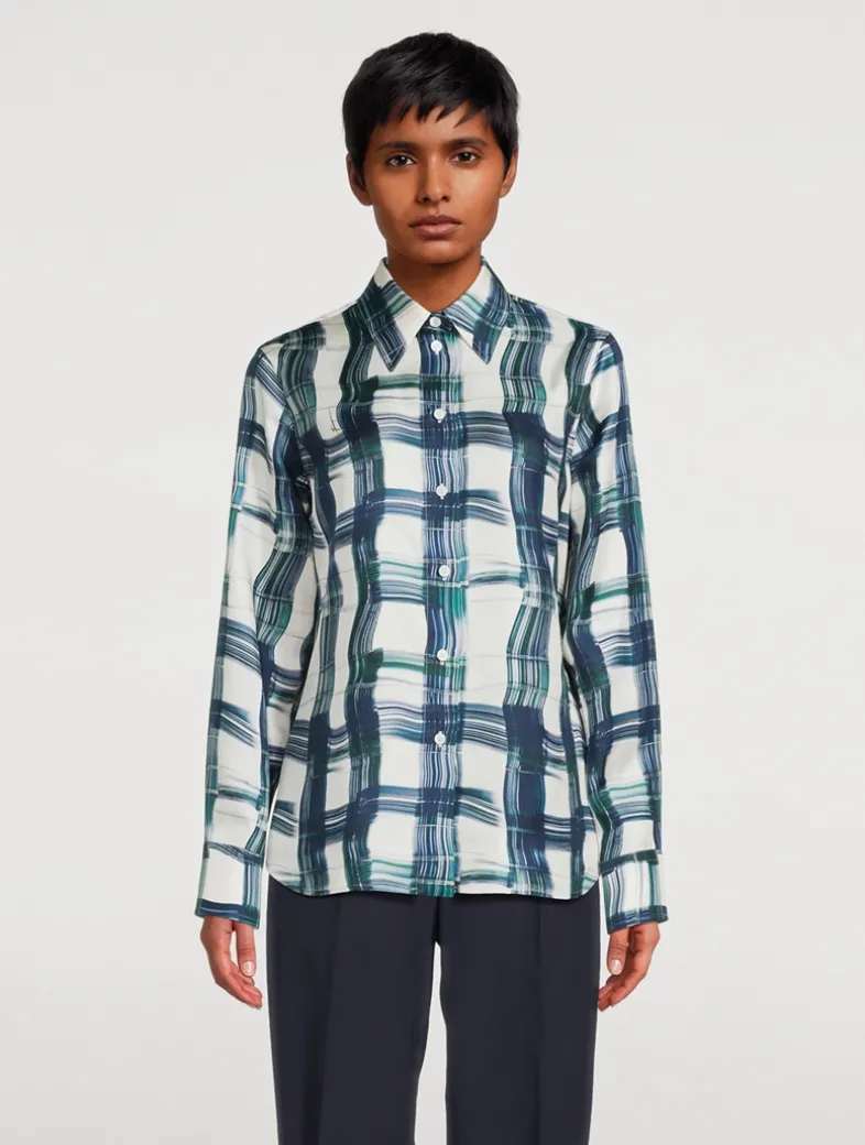 The silk shirt is printed with a maxi tartan motif with brush stroke effect. Following the lines of masculine tailoring, the cut is straight, with a back yoke and a straight fit on the bust.