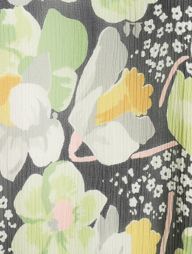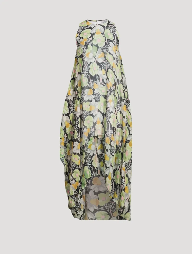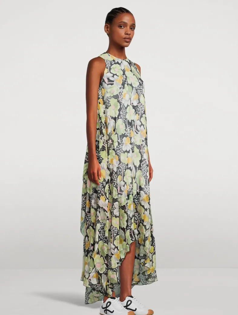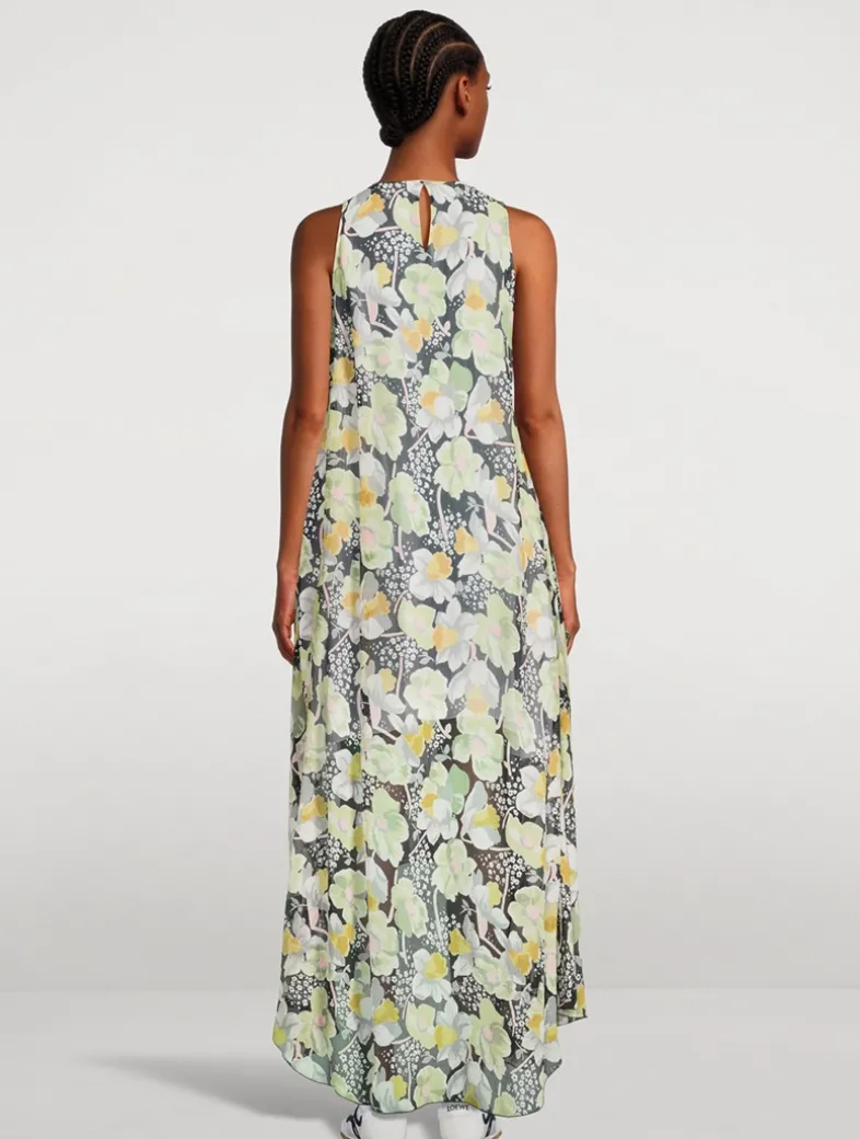 A fluid sleeveless dress in lightweight silk crepon, adorned with an allover daffodil floral print and an asymmetric construction. Fully lined, the piece is finished with a round neck, topstitching detail, and seam pockets.