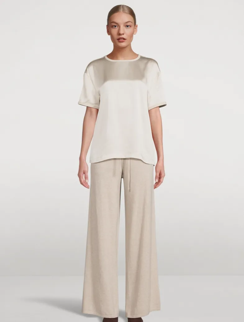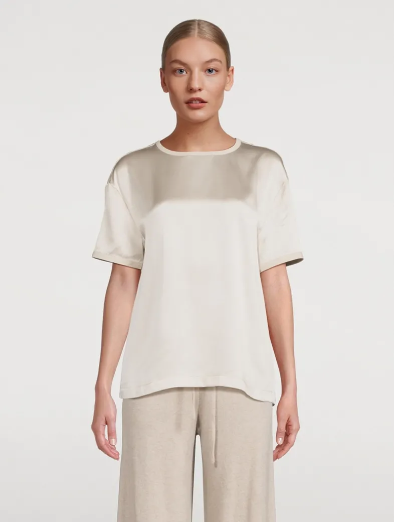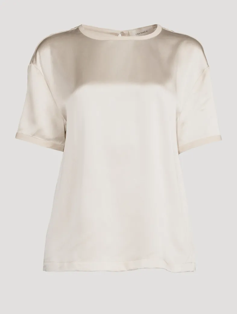 In woven heavy silk, the roundneck tee has a relaxed fit, neat, short sleeves, and is detailed by tubular, neat panelling trims. Its minimalist look ensures it can be layered or worn on its own.