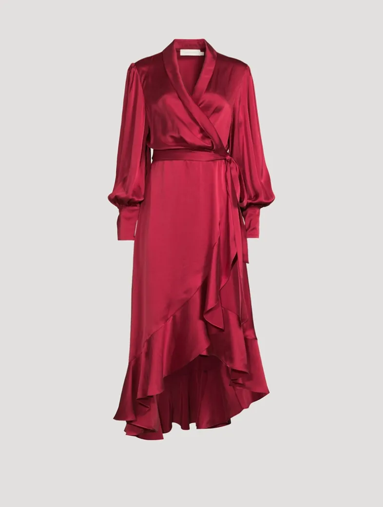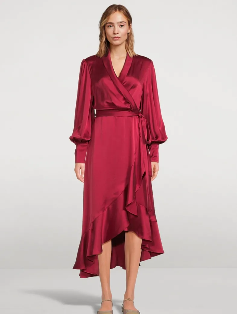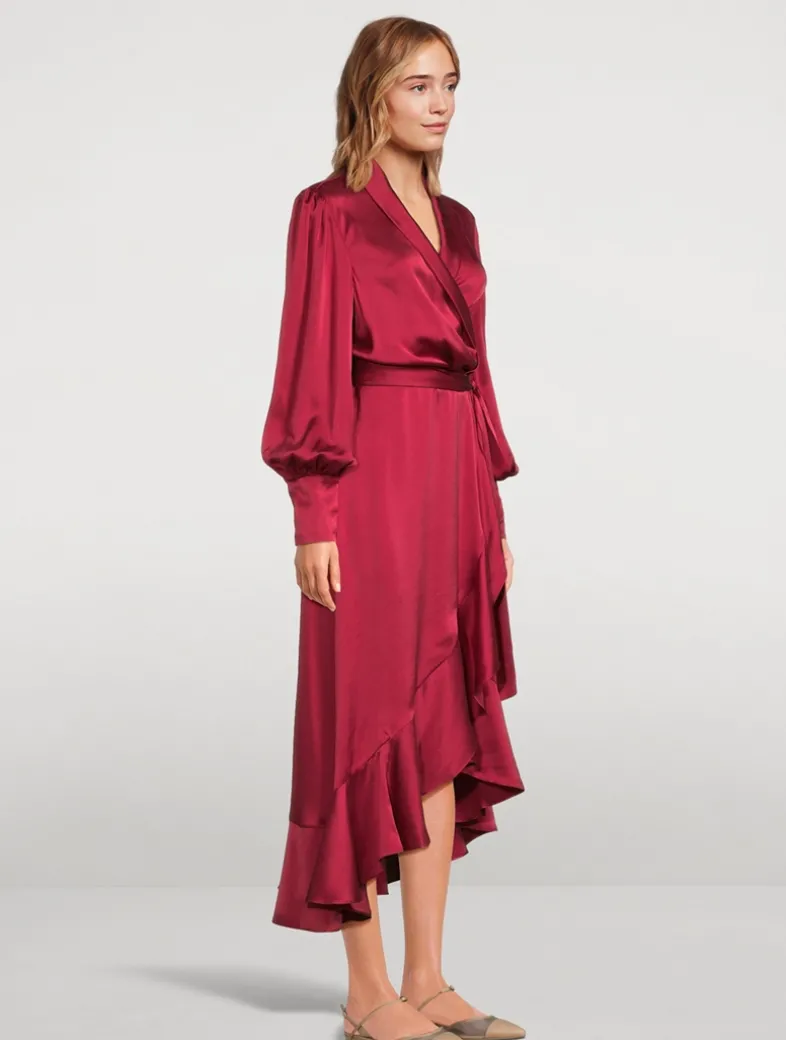 This silk midi dress has a wrap-front silhouette and a fluid asymmetric skirt. It has long blouson sleeves with buttoned-down deep sleeve cuffs.