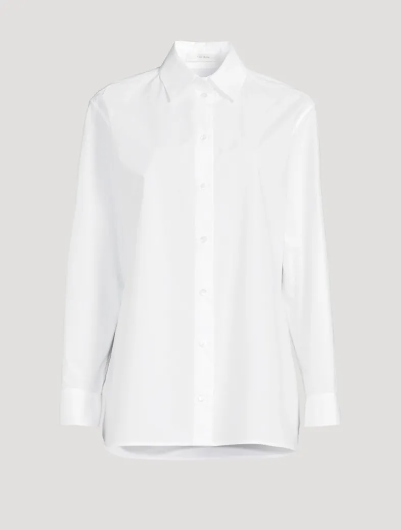 Made in Italy, this timeless menswear-inspired button-up shirt is crafted in crisp cotton poplin with center front exposed placket and classic shirt hem finish.
